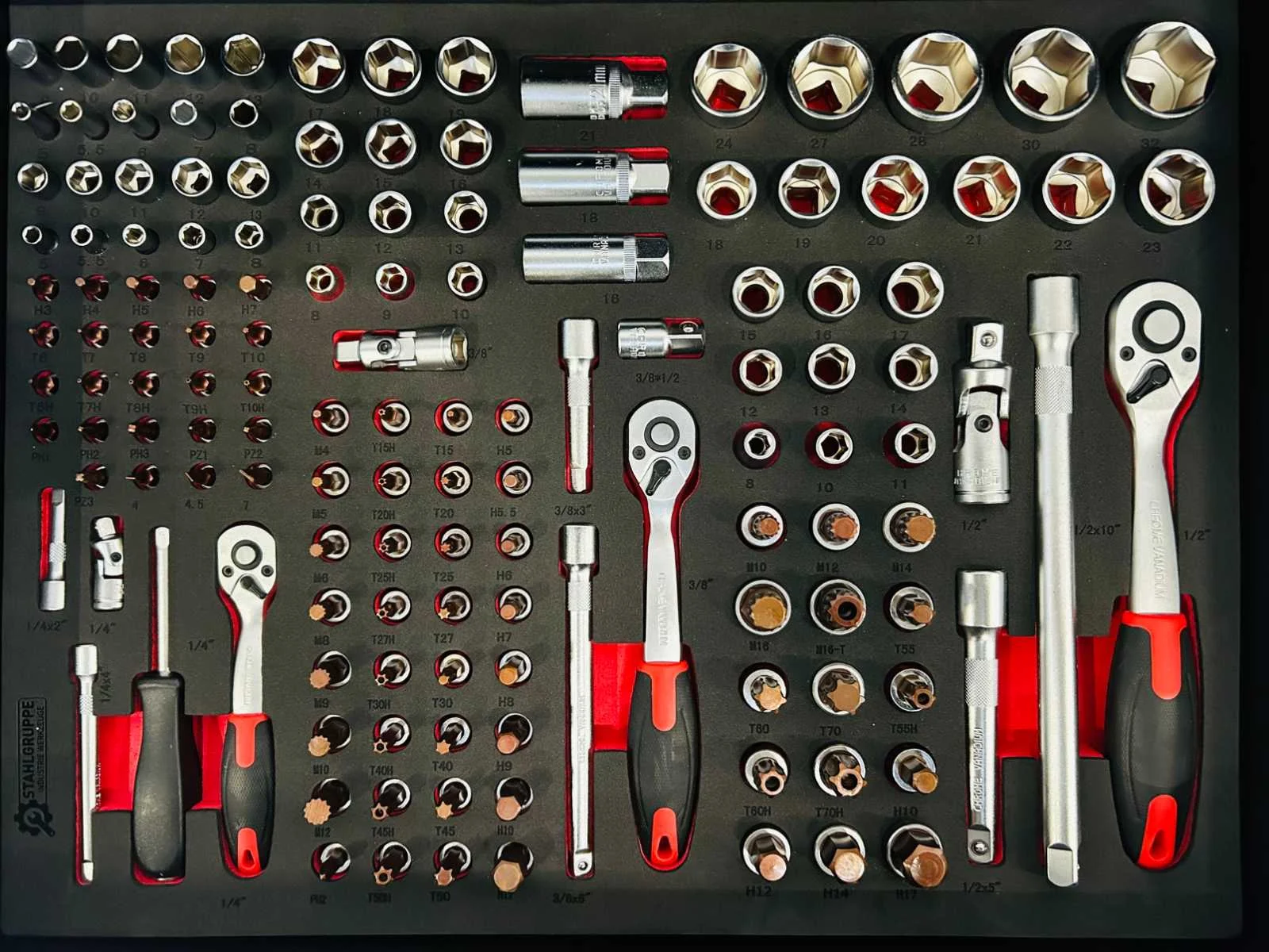 Kar met afneembare topbox; topbox met 8 laden en boven klep; Kar met 5 laden en kast met dubbele openslaande deuren; 13laden - 9 gevuld; 2 zwenkwielen waarvan 2 geremd; 7212 Merk: Stahlgruppe Model: SG2024 Type: 327-delige Kleur: rood - zwart Gewicht: 215kg Lengte: 144cm Breedte: 54cm Hoogte: 154cm