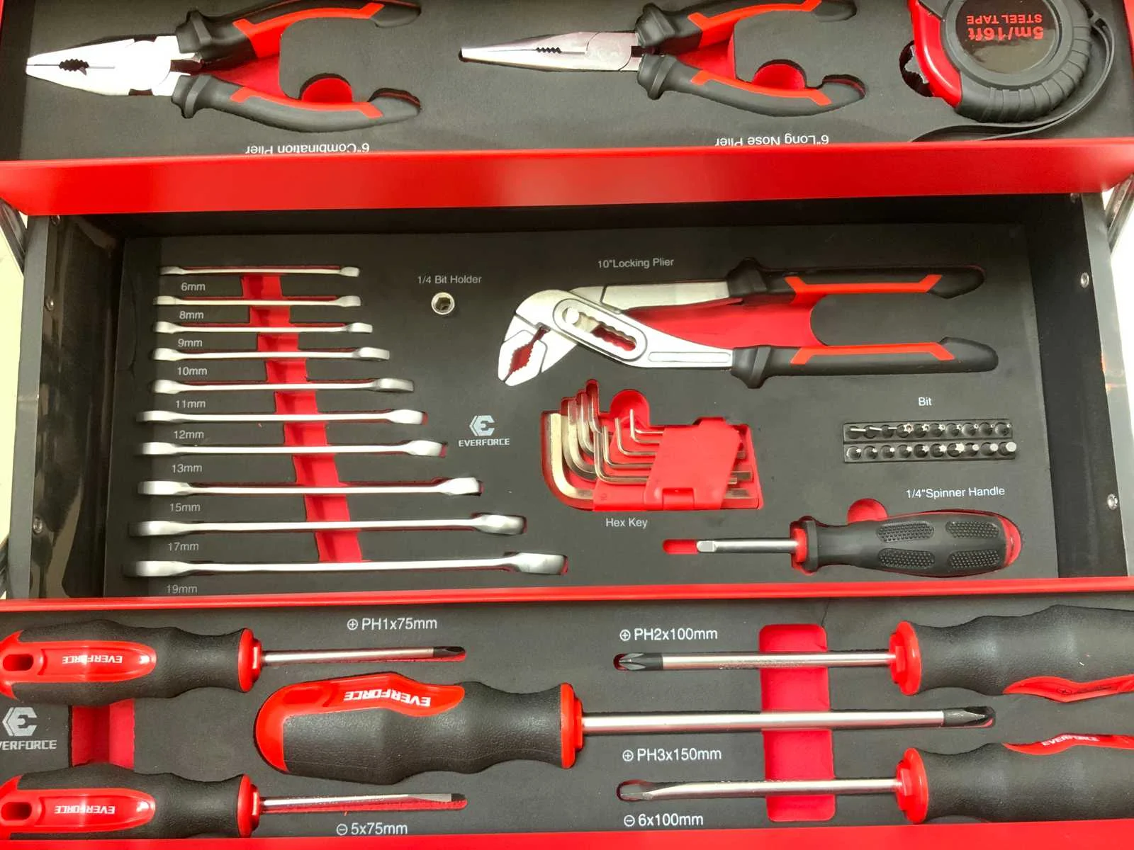 Doppenset 1/4” 4-4.5-5-5.5-6-7-8-9-10-11-12-13; Doppenset 1/2” 10-11-12-13-14-15-16-17-19-20-21-22-23-24-27-30-32; ring steeksleutel 6-8-9-10-11-12-13-15-17-19; bitset; inbussleutel set; tangen; schroevendraaiers; 5m rolmeter; afmeting gereedschapskist gesloten; 470x210x210mm; 5775 Merk: Everforce Type: EF-3201 Metaal: true Afmeting l: 470mm Afmeting b: 210mm Afmeting h: 210mm