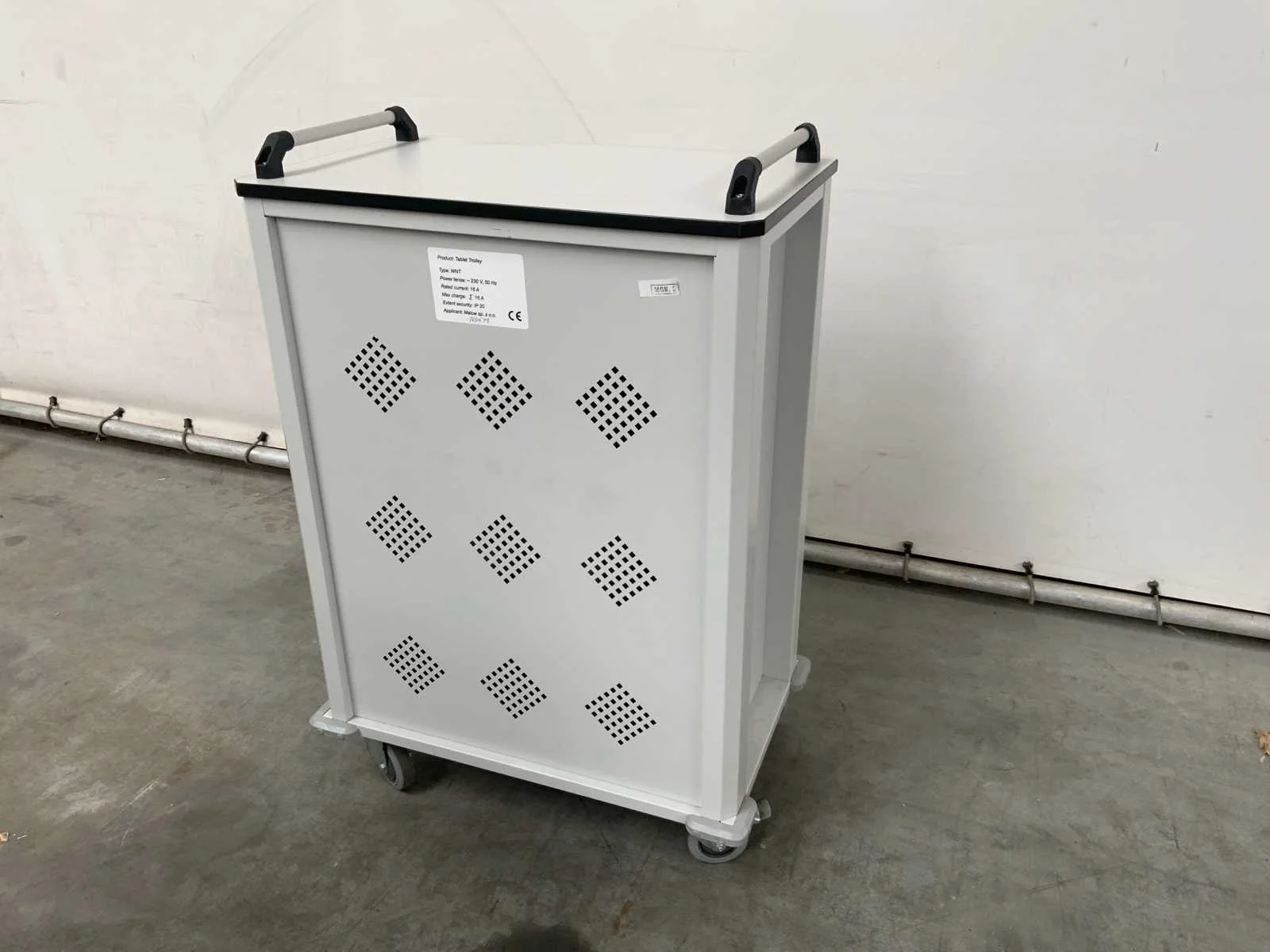 Opberg/oplaadstation voor tablets en laptops, Voorzien van zwenkwielen, 230v aansluiting, 32 vakken, betreft een ongebruikt product