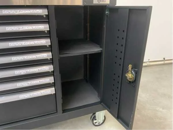 V.v. gereedschap 274-delig; 4 wielen waarvan 2 met rem; stuurgroep; werkblad; 7lades; 1 afsluitbare kast met legbord; 2 sleutel sets; ongebruikt in doos; 2419; Merk: SG Tools Aantal laden: 7 Met inhoud: true Totale afmeting L: 1130mm Totale afmeting Breedte: 460mm Totale afmeting Hoogte: 990mm