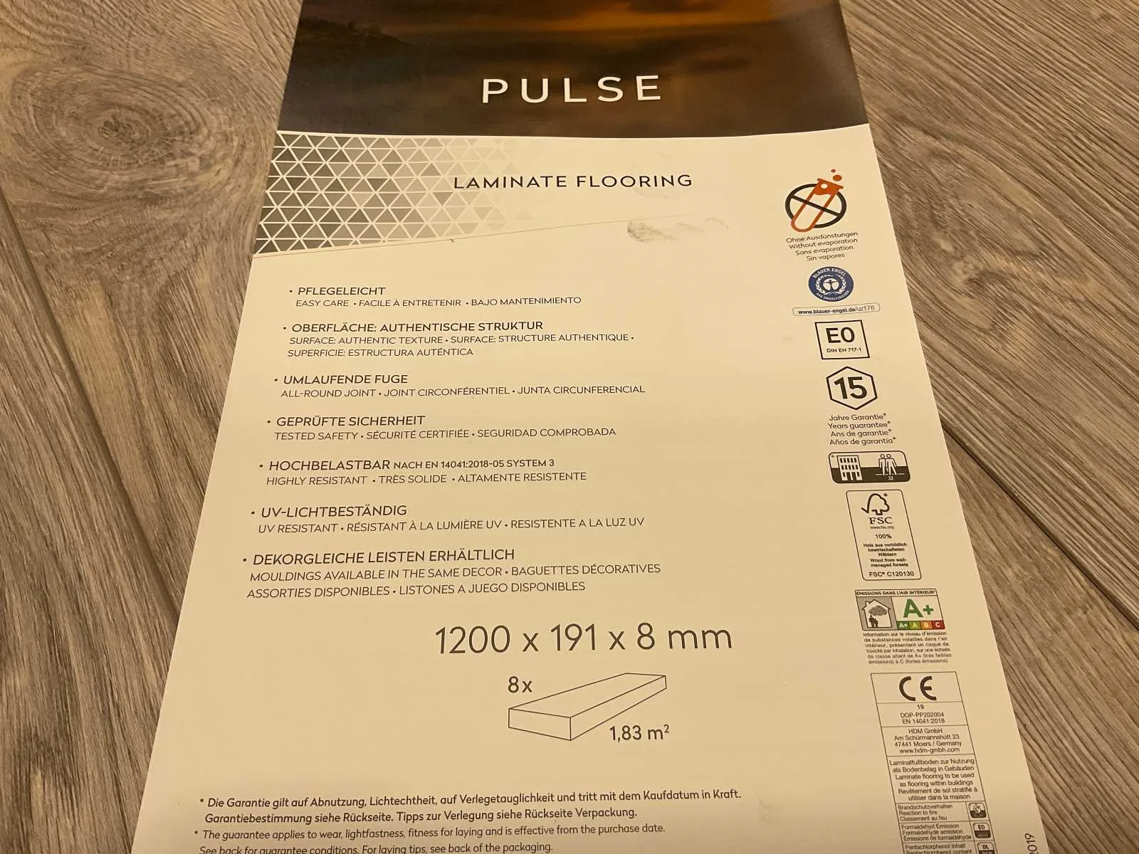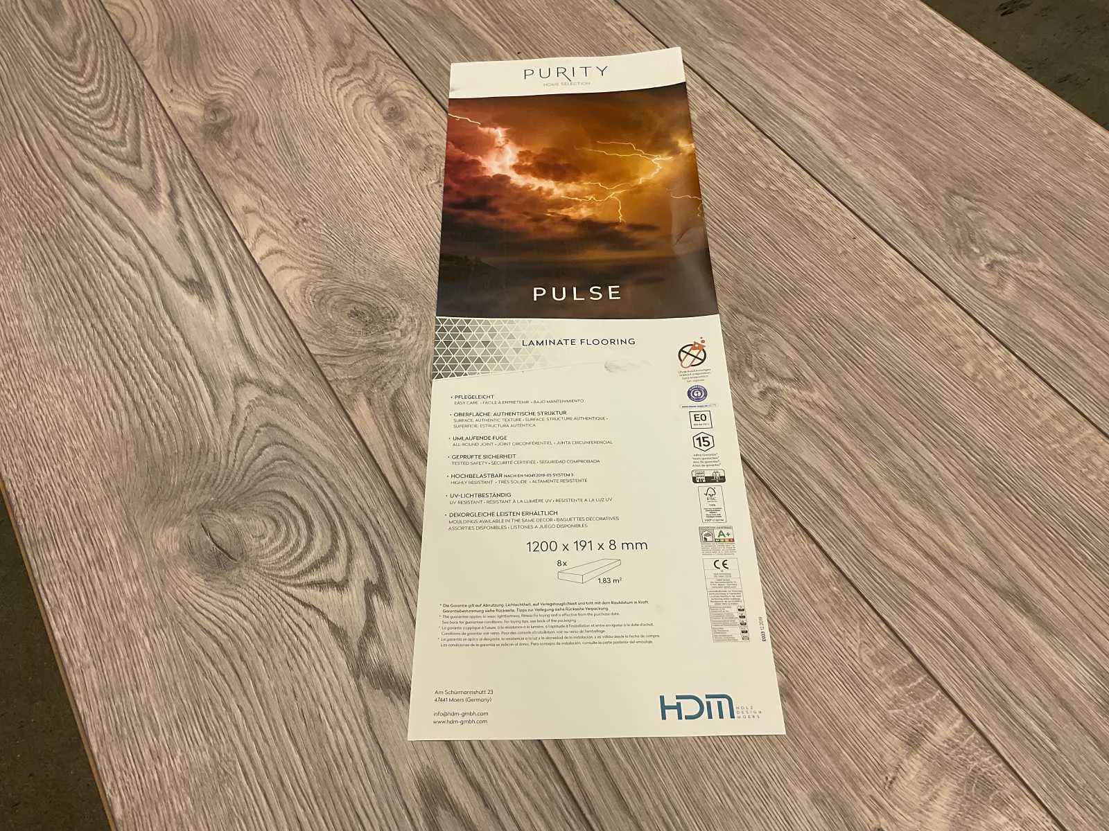 Pulse modern eiken laminaat van het merk Purity à 1,83m² per pak = totaal van 1,83m². Merk: Purity Model: Pulse Product type: Laminaat Oppervlakte: 1.83m² Geschikt voor vloerverwarming: true V-groef: true Aantal m² per verpakking: 1.83m² Kleur: Modern eiken Gewicht: 13.2kg Lengte: 1200mm Breedte: 191mm Hoogte: 8mm Materiaal: HDF