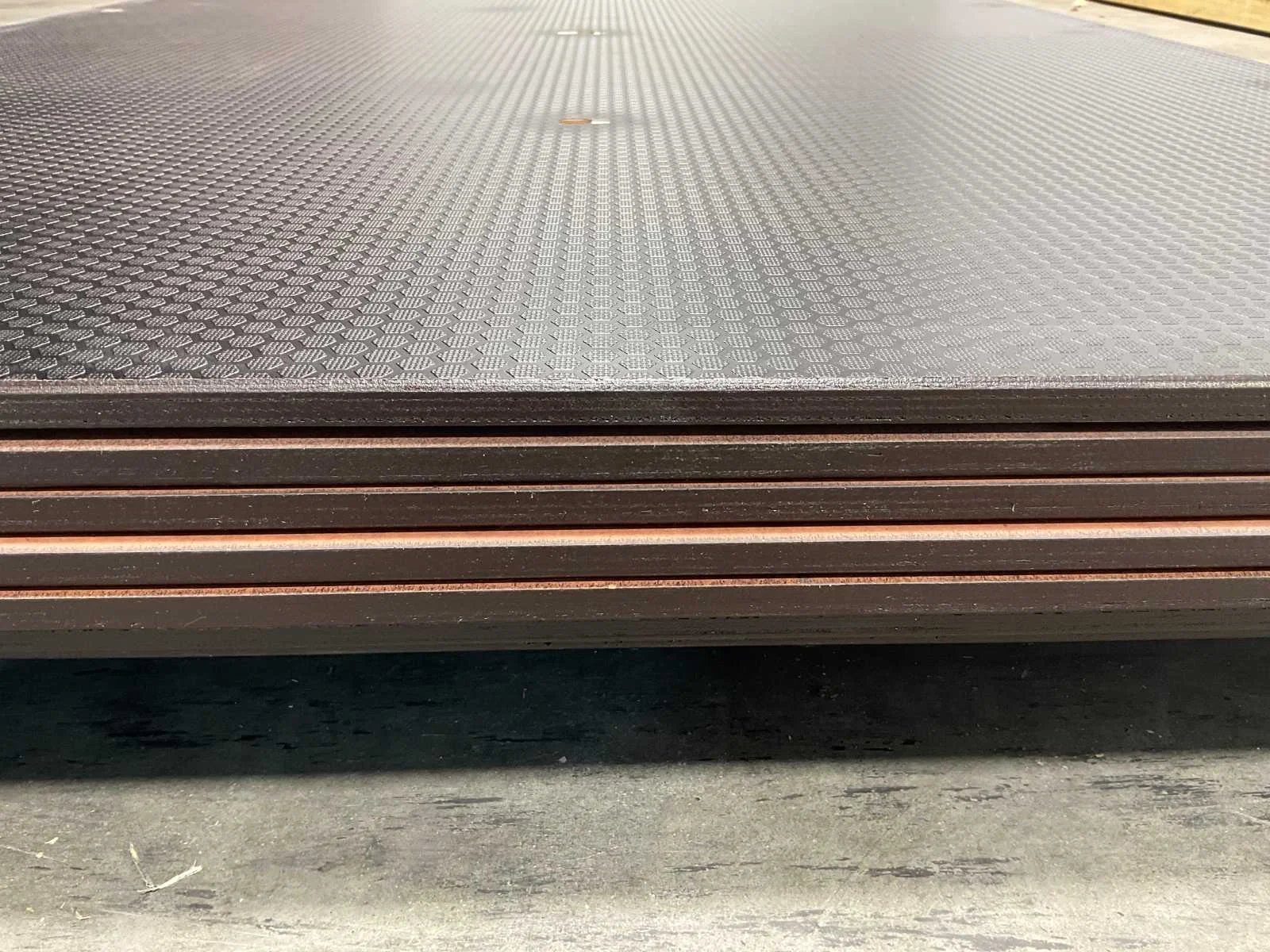 KoskiRuby plaat 2390 x 1195 x 12 mm. KoskiRuby is een duurzaam vloermateriaal met een harde slijtvaste overlay. Tijdens het coatingproces wordt er een antisliplaag in zeghoekig robijnpatroon op de filmlaag geperst 'hot pressed'. Het verhoogde antislip zeshoekige patroon behoudt zijn antislipeigenschappen onder een breed scala aan klimatologische omstandigheden omstandigheden, en daarom is KoskiRuby een ideaal materiaal voor veeleisende bevloering. KoskiRuby is speciaal geschikt voor steigers, laden, platforms, podia, tribunes, terrassen, sport, speeltuin faciliteiten en aanhangwagens. Voordelen van KoskiRuby multiplex: Hoog draagvermogen Slijtvast oppervlak Slipvast oppervlak Milieuvriendelijk gedurende de gehele levenscyclus Lengte: 2390mm Breedte: 1195mm Hoogte: 12mm
