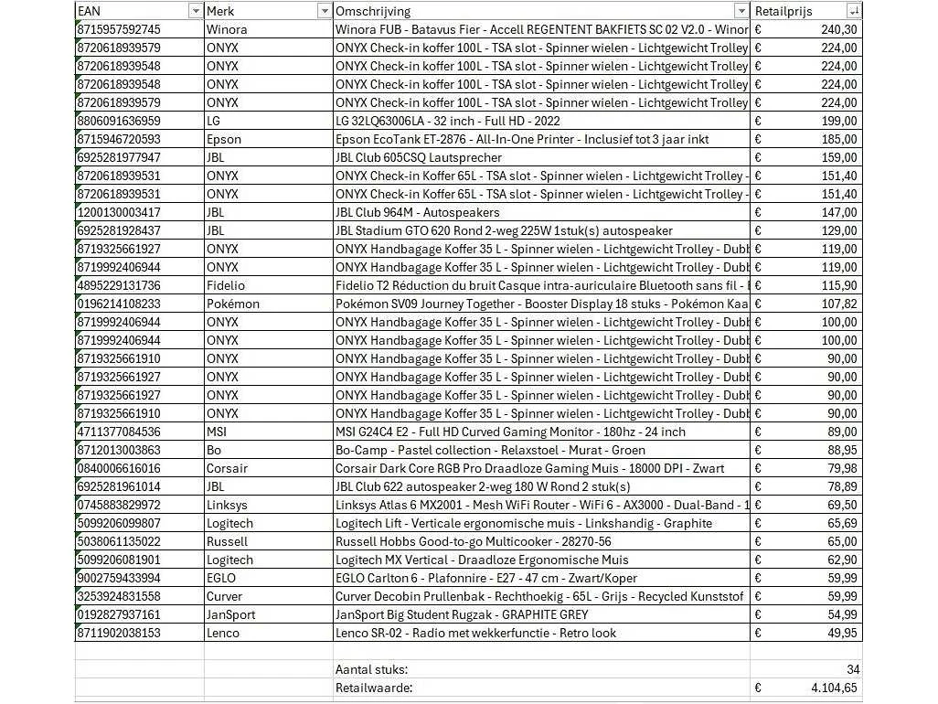 Dit betreft een partij A-merk retourgoederen van een grote online retailer. De partij bestaat uit diverse productcategorieën. Aantal stuks: 34. Retailwaarde: €4105,- Ongecontroleerd: werking onbekend (mix van werkend, incompleet, beschadigd, te gebruiken voor onderdelen). Kom op de kijkdag om te om zo een goed beeld te krijgen van de reden van retour. Zie foto's voor lijst met inhoud. Bezorgtermijn 14 dagen Merk: Pallet Retourgoederen