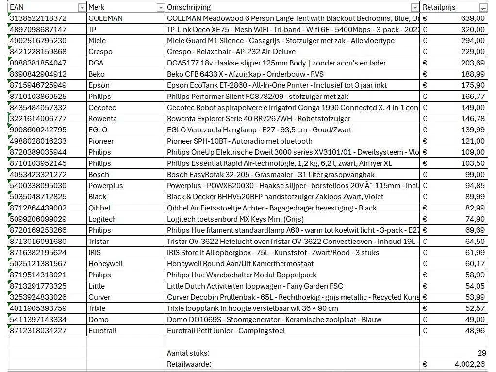 Dit betreft een partij A-merk retourgoederen van een grote online retailer. De partij bestaat uit diverse productcategorieën. Aantal stuks: 29. Retailwaarde: €4002,- Ongecontroleerd: werking onbekend (mix van werkend, incompleet, beschadigd, te gebruiken voor onderdelen). Kom op de kijkdag om te om zo een goed beeld te krijgen van de reden van retour. Zie foto's voor lijst met inhoud. Bezorgtermijn 14 dagen Merk: Pallet Retourgoederen