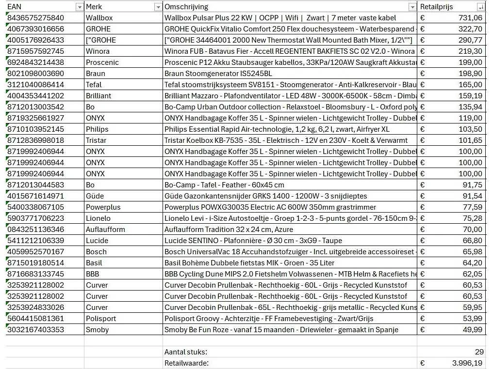 Dit betreft een partij A-merk retourgoederen van een grote online retailer. De partij bestaat uit diverse productcategorieën. Aantal stuks: 29. Retailwaarde: €3996,- Ongecontroleerd: werking onbekend (mix van werkend, incompleet, beschadigd, te gebruiken voor onderdelen). Kom op de kijkdag om te om zo een goed beeld te krijgen van de reden van retour. Zie foto's voor lijst met inhoud. Bezorgtermijn 14 dagen Merk: Pallet Retourgoederen