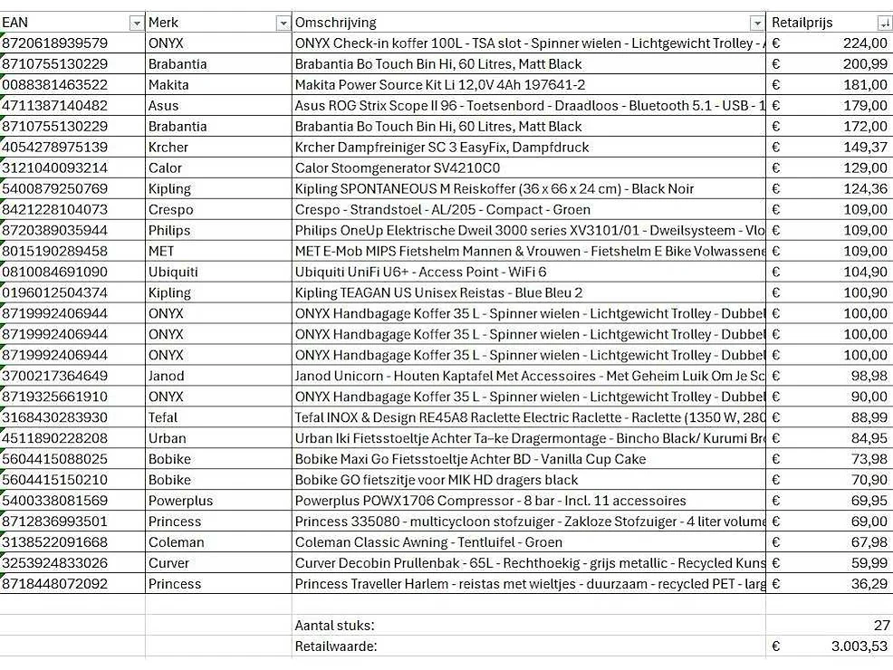Dit betreft een partij A-merk retourgoederen van een grote online retailer. De partij bestaat uit diverse productcategorieën. Aantal stuks: 27. Retailwaarde: €3004,- Ongecontroleerd: werking onbekend (mix van werkend, incompleet, beschadigd, te gebruiken voor onderdelen). Kom op de kijkdag om te om zo een goed beeld te krijgen van de reden van retour. Zie foto's voor lijst met inhoud. Bezorgtermijn 14 dagen Merk: Pallet Retourgoederen