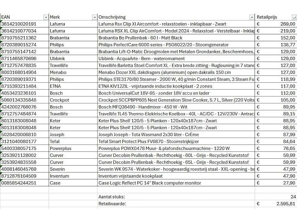 Dit betreft een partij A-merk retourgoederen van een grote online retailer. De partij bestaat uit diverse productcategorieën. Aantal stuks: 24. Retailwaarde: €2596,- Ongecontroleerd: werking onbekend (mix van werkend, incompleet, beschadigd, te gebruiken voor onderdelen). Kom op de kijkdag om te om zo een goed beeld te krijgen van de reden van retour. Zie foto's voor lijst met inhoud. Bezorgtermijn 14 dagen Merk: Pallet Retourgoederen