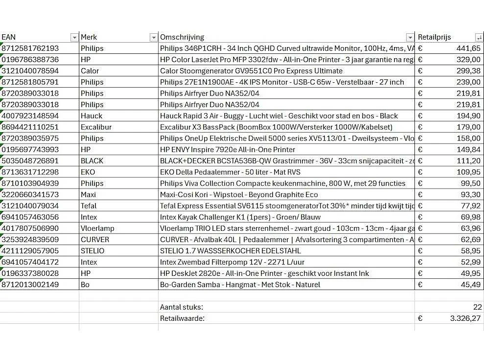 Dit betreft een partij A-merk retourgoederen van een grote online retailer. De partij bestaat uit diverse productcategorieën. Aantal stuks: 22. Retailwaarde: €3326,- Ongecontroleerd: werking onbekend (mix van werkend, incompleet, beschadigd, te gebruiken voor onderdelen). Kom op de kijkdag om te om zo een goed beeld te krijgen van de reden van retour. Zie foto's voor lijst met inhoud. Bezorgtermijn 14 dagen Merk: Pallet Retourgoederen
