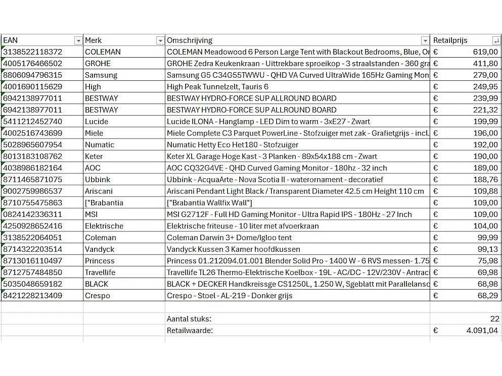 Dit betreft een partij A-merk retourgoederen van een grote online retailer. De partij bestaat uit diverse productcategorieën. Aantal stuks: 22. Retailwaarde: €4091,- Ongecontroleerd: werking onbekend (mix van werkend, incompleet, beschadigd, te gebruiken voor onderdelen). Kom op de kijkdag om te om zo een goed beeld te krijgen van de reden van retour. Zie foto's voor lijst met inhoud. Bezorgtermijn 14 dagen Merk: Pallet Retourgoederen