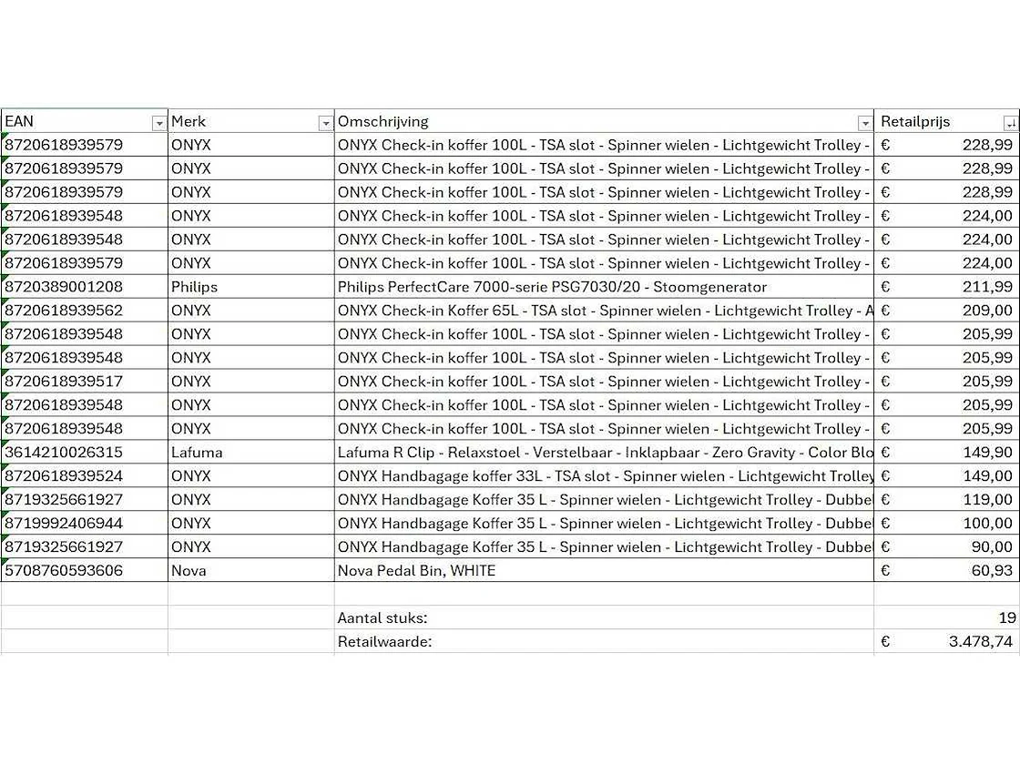 Dit betreft een partij A-merk retourgoederen van een grote online retailer. De partij bestaat uit diverse productcategorieën. Aantal stuks: 19. Retailwaarde: €3479,- Ongecontroleerd: werking onbekend (mix van werkend, incompleet, beschadigd, te gebruiken voor onderdelen). Kom op de kijkdag om te om zo een goed beeld te krijgen van de reden van retour. Zie foto's voor lijst met inhoud. Bezorgtermijn 14 dagen Merk: Pallet Retourgoederen