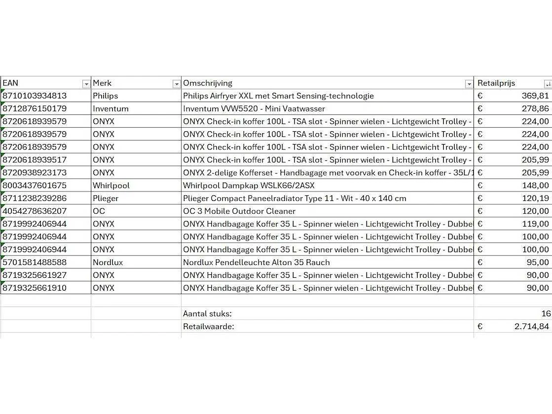 Dit betreft een partij A-merk retourgoederen van een grote online retailer. De partij bestaat uit diverse productcategorieën. Aantal stuks: 16. Retailwaarde: €2715,- Ongecontroleerd: werking onbekend (mix van werkend, incompleet, beschadigd, te gebruiken voor onderdelen). Kom op de kijkdag om te om zo een goed beeld te krijgen van de reden van retour. Zie foto's voor lijst met inhoud. Bezorgtermijn 14 dagen Merk: Pallet Retourgoederen