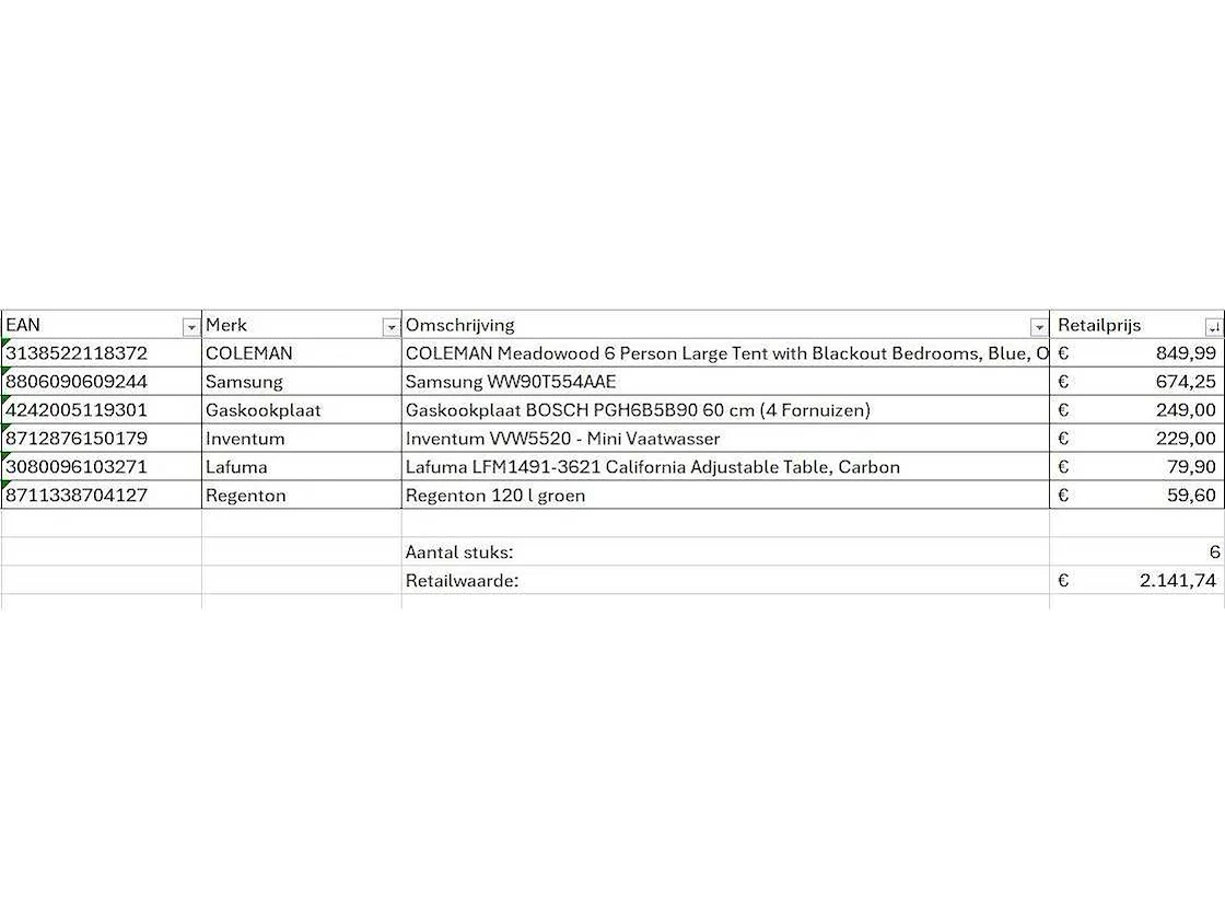 Dit betreft een partij A-merk retourgoederen van een grote online retailer. De partij bestaat uit diverse productcategorieën. Aantal stuks: 6. Retailwaarde: €2142,- Ongecontroleerd: werking onbekend (mix van werkend, incompleet, beschadigd, te gebruiken voor onderdelen). Kom op de kijkdag om te om zo een goed beeld te krijgen van de reden van retour. Zie foto's voor lijst met inhoud. Bezorgtermijn 14 dagen Merk: Pallet Retourgoederen