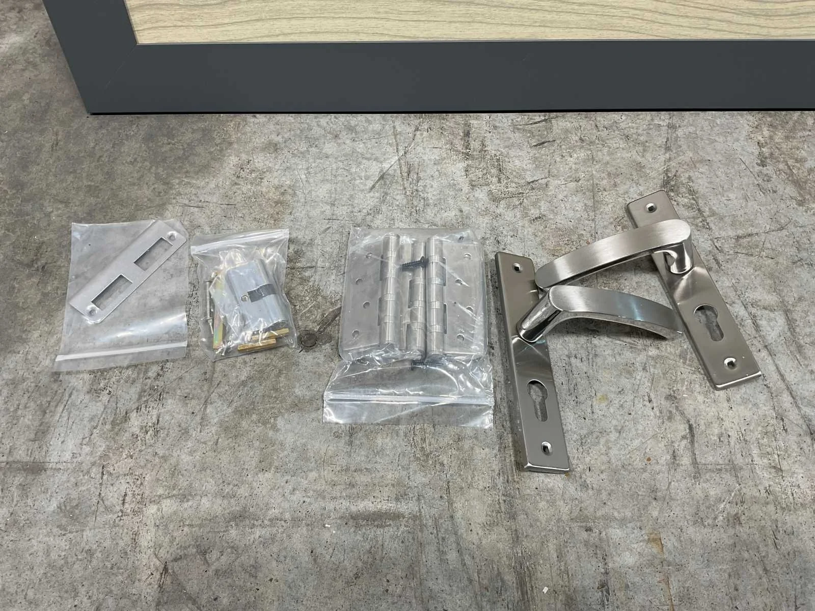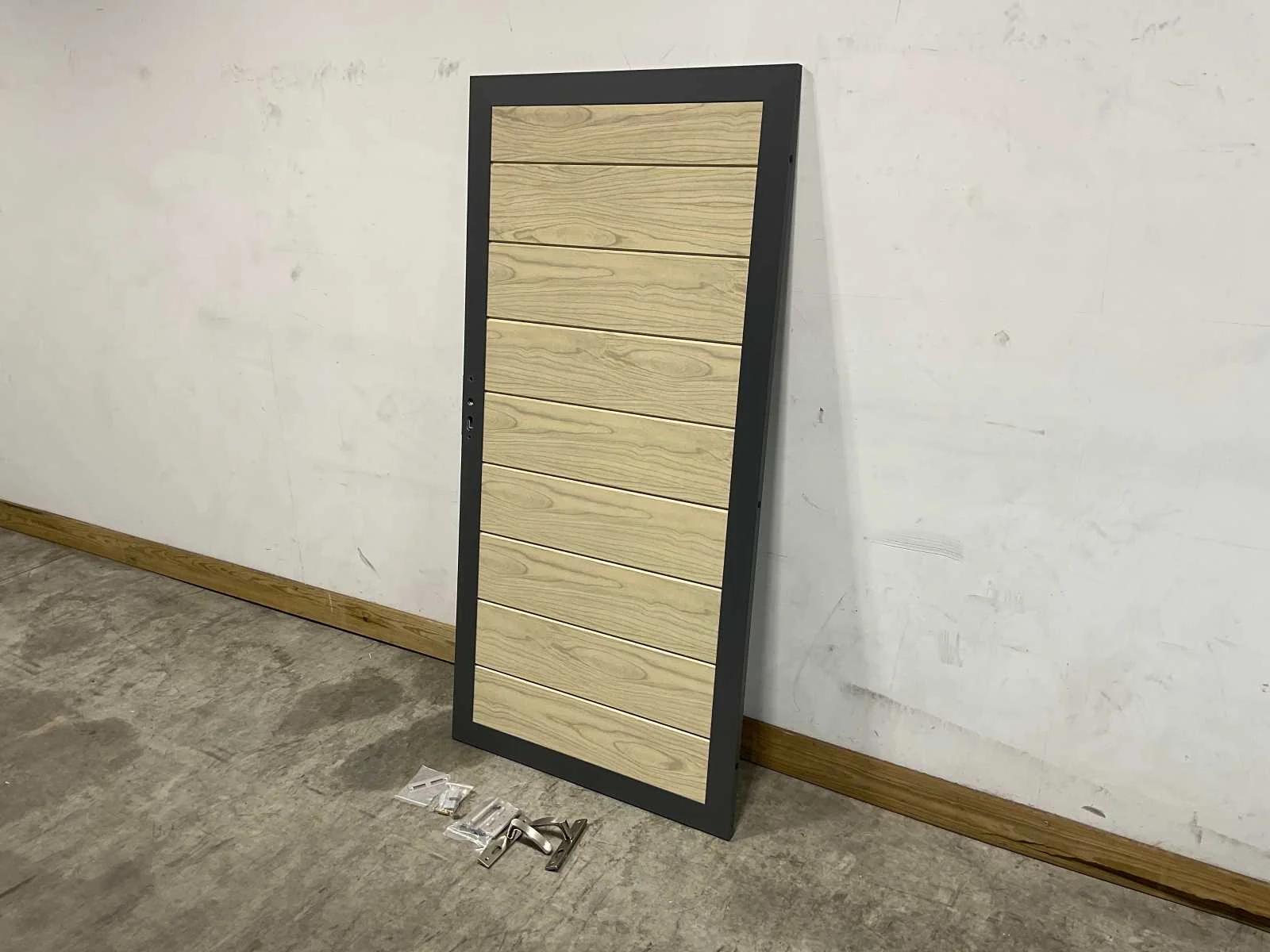 Kavel bevat: 1x Aluminium deur in aluminium frame (183 x 90 cm) 1x Hang-en sluitwerk Let op: Wordt geleverd ZONDER palen. Buitendeur: true Stomp: true Afmeting h: 1830mm Afmeting b: 930mm Aluminium: true Kleur: Houtlook