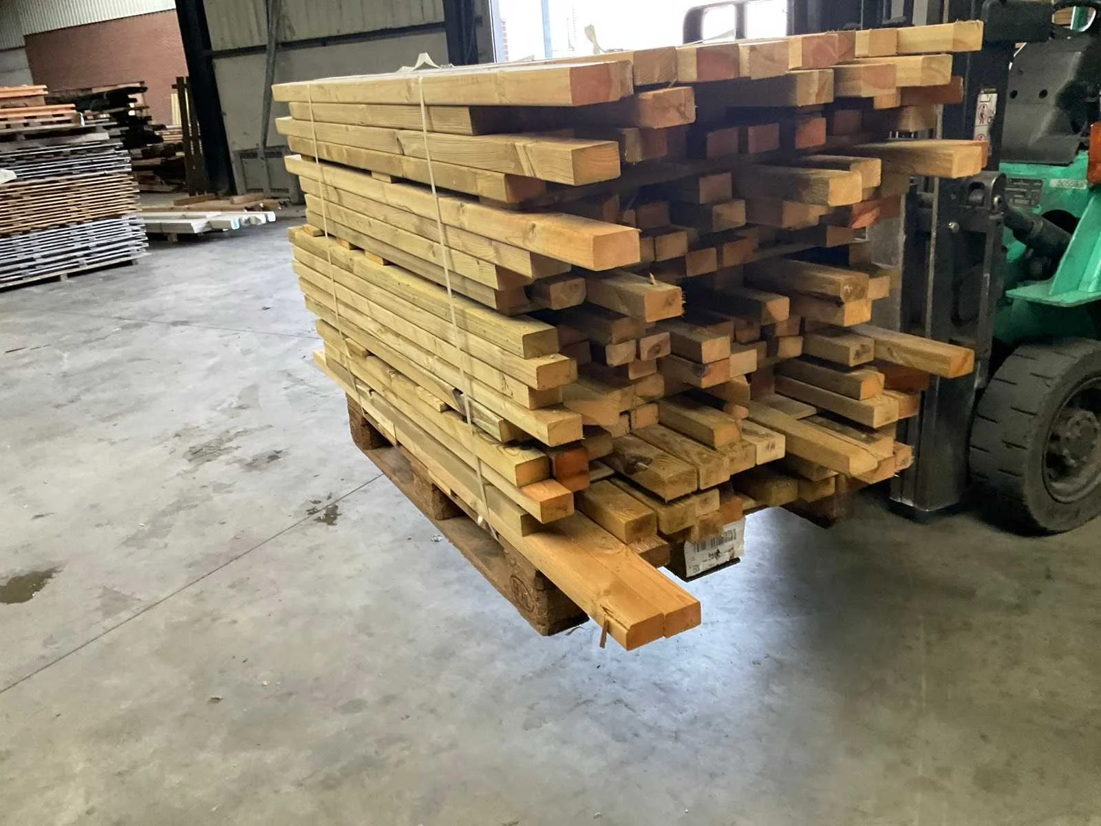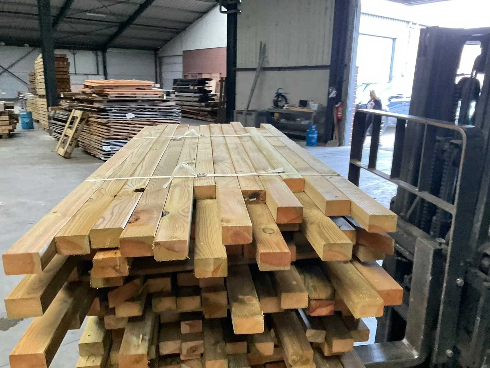 Partij grenen geïmpregneerde balken 80-180x6,5x4,5 cm. Bestaat uit diverse lengtes 80-180cm, in totaal ca. 250 lopende meter. Zie foto's voor details. Houtsoort: Grenenhout geimperneerd Kopmaat: 45x65 Gewicht: 400kg