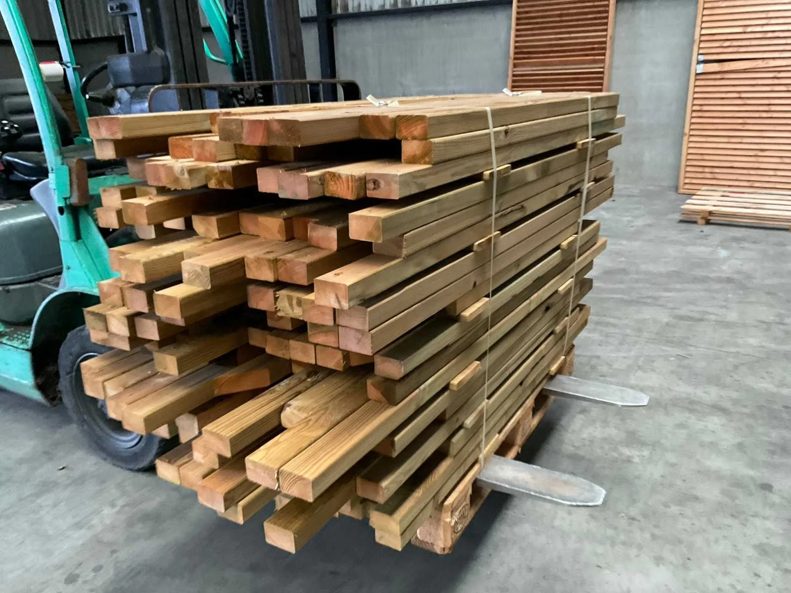 Partij grenen geïmpregneerde balken 80-180x6,5x4,5 cm. Bestaat uit diverse lengtes 80-180cm, in totaal ca. 250 lopende meter. Zie foto's voor details. Houtsoort: Grenenhout geimperneerd Kopmaat: 45x65 Gewicht: 400kg