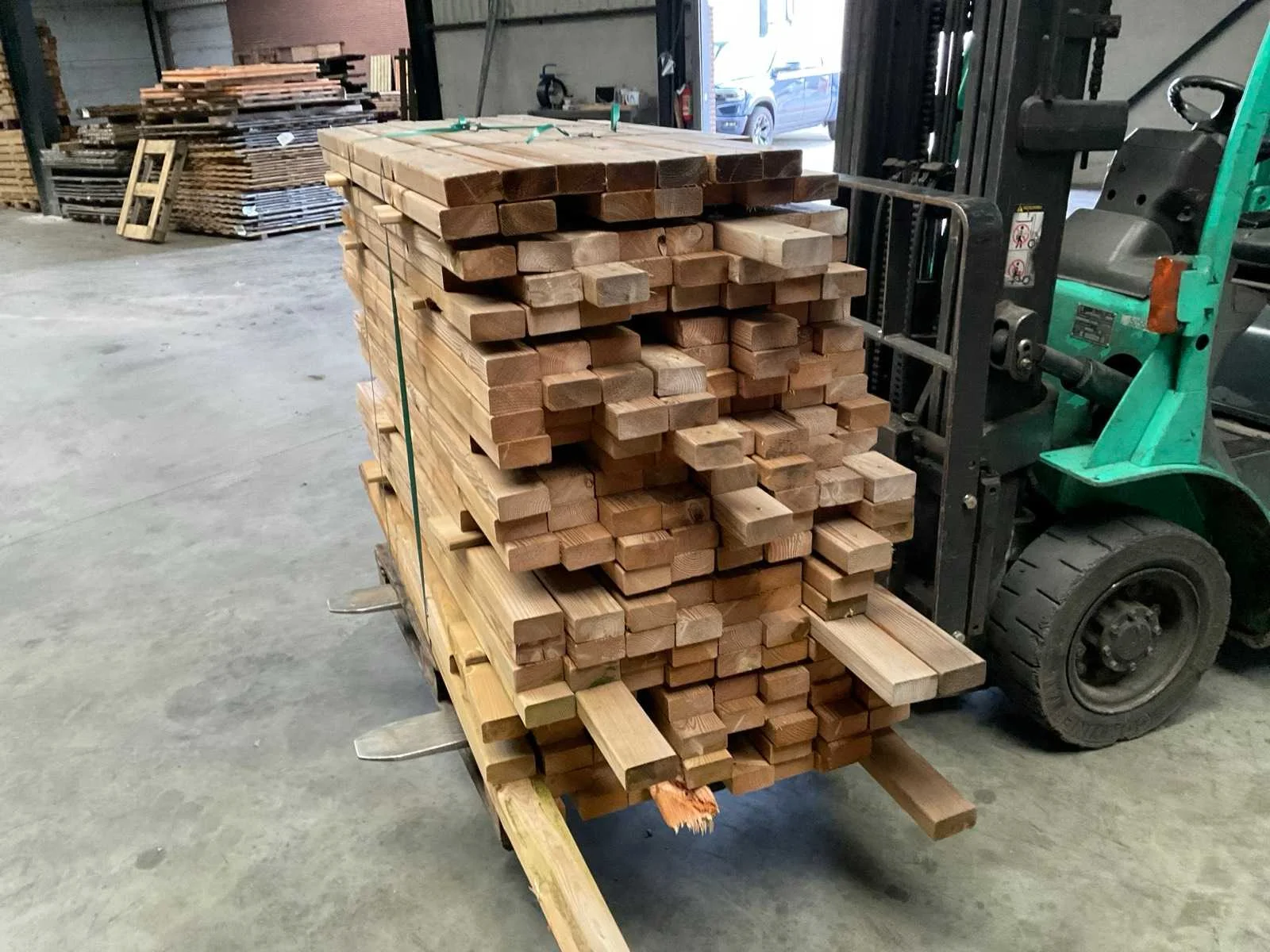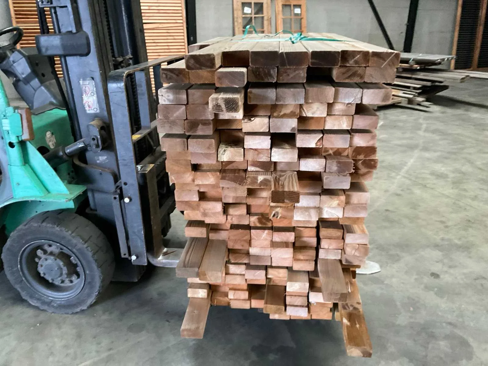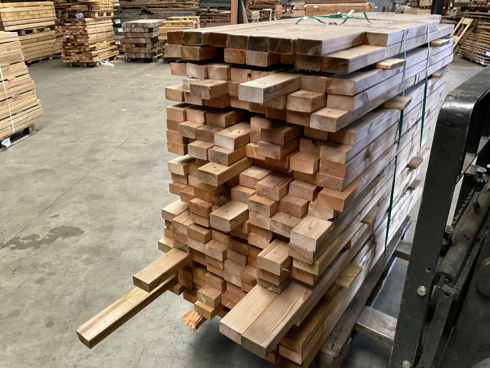 Partij grenen geïmpregneerde balken 80-150x9x4,5 cm. Bestaat uit diverse lengtes 80-150cm, in totaal ca. 250 lopende meter. Zie foto's voor details. Houtsoort: Grenenhout geimperneerd Kopmaat: 45x90 Gewicht: 400kg