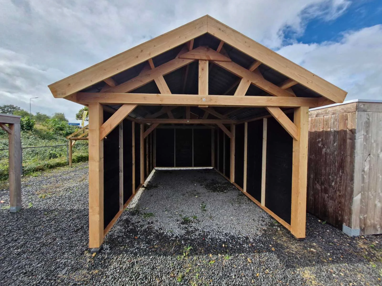 Deze frameconstructie met een klassiek zadeldak is gemaakt van fijnbezaagd Douglas-hout en wordt geleverd als bouwpakket. Het pakket bevat de volgende onderdelen: Palen: 150x150mm fijnbezaagd Douglas ( 10 stuks ) Spant onderdelen: 50x150mm fijnbezaagd Douglas Dakbalken: 50x150mm fijnbezaagd Douglas Doeideel: 20x200mm fijnbezaagd Douglas Wanden worden geleverd in los materiaal douglas zweedsrabat 1,1x2,7mm dik zwart geimperneerd op vuren regelwerk 40x60mm Dakpanplaat staal ral 7016 antraciet grijs De afmetingen zijn buitenwerks gemeten vanaf het dak. Bij een breedte van 410 cm staan de palen buitenwerks op 360 cm, zoals aangegeven in de schets. Het bouwpakket is op maat gezaagd en wordt geleverd inclusief bevestigingsmateriaal en handleiding. Betonpoeren zijn niet inbegrepen. Afmetingen pakket: 420x125x150cm, 1950kg Model: Zadeldak Product type: Vrijstaande overkapping Gewicht: 1950kg Lengte: 1215cm Breedte: 410cm Hoogte: 340cm Materiaal: Douglas