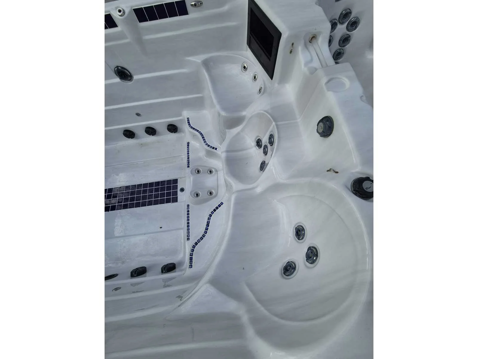 Voorzien van grote zwem jets om tegen in te zwemmen voor top sport; 5 zitplaatsen en 1 ligplaats; kunststof omkasting; Amerikaanse besturingssysteem; led verlichting; dubbel cabine zwemspa; afzonderlijk van elkaar temperatuur in te stellen; Niet getest op functioneren (Marge, geen BTW) Merk: Balboa Model: 15 persoons Product type: Dubbele cabine Spanning: 380V Verlichting: Ja Jets: 67 Aantal personen: 15 Lengte: 560cm Breedte: 230cm Hoogte: 136cm