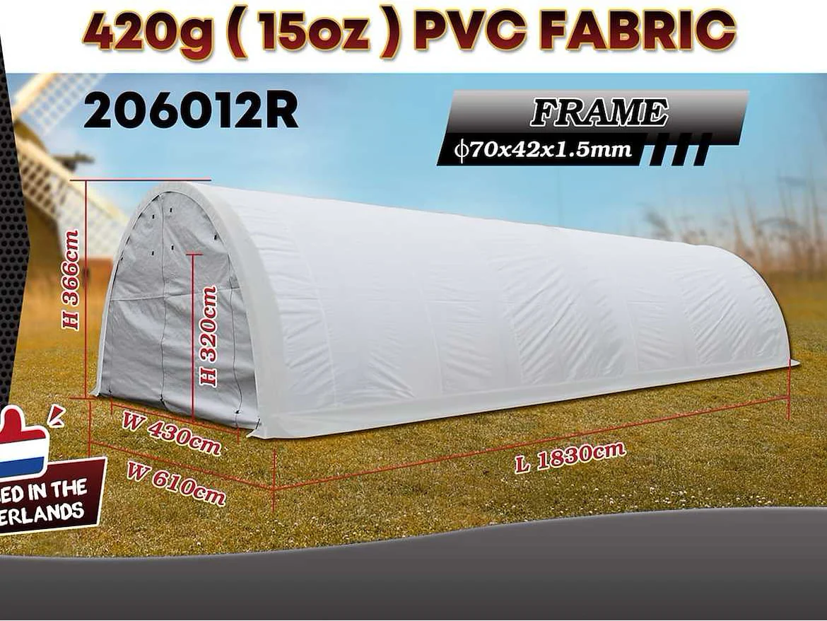 Voorzien van opslagtent / opslag shelter; singel trussen-/buizensysteem; gegalvaniseerd; beide uiteinden een deur; materiaal 420 gram PVC cover; kleur wit; inclusief montage handleiding; ongebruikt in metalen kist (transport afmetingen 216x75x82 cm) Merk: Rhino-Cross-Shelter Type: 206012R - 18,3x6,1x3,66 m Bouwjaar: 2025 Eigen gewicht: 730kg Totale afmeting L: 18300mm Totale afmeting Breedte: 6100mm Totale afmeting Hoogte: 3660mm