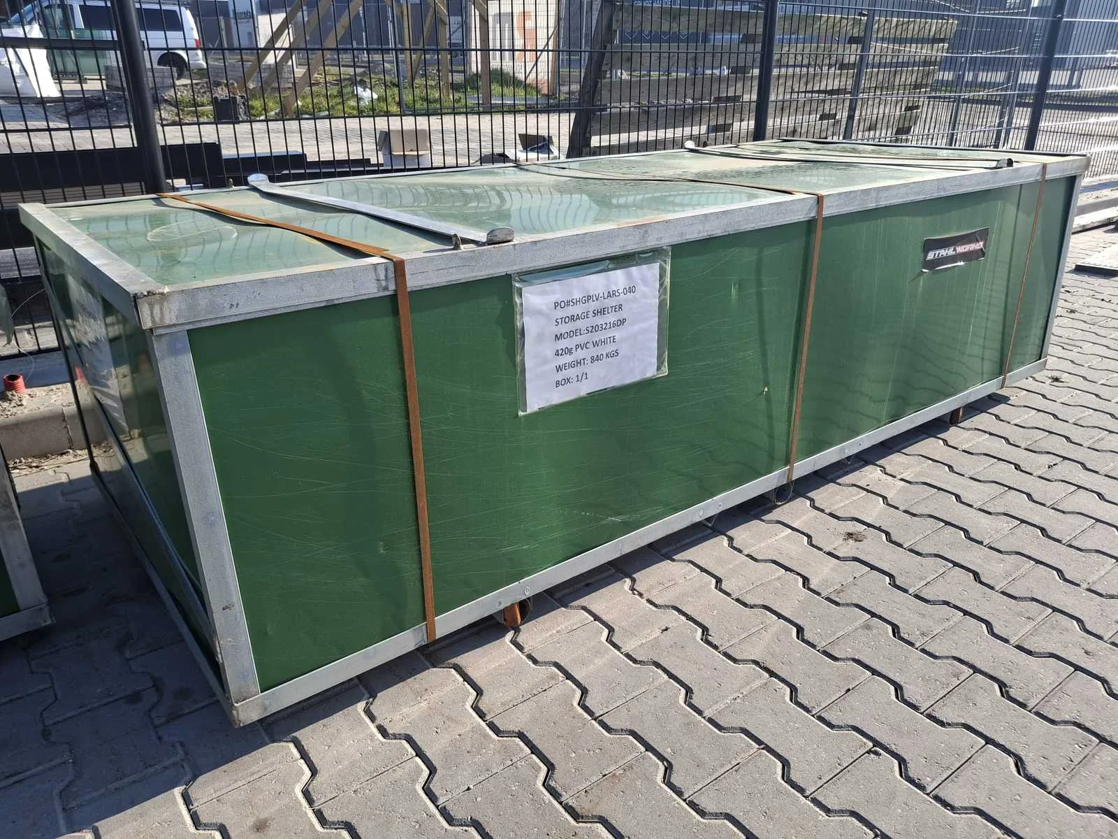 Voorzien van opslagtent / shelter; dubbel trussen-/buizensysteem; gegalvaniseerd; 2 deuren met lier; ruimte tussen bogen 244 cm; materiaal 420 gram PVC cover; kleur wit; inclusief montage handleiding; ongebruikt in metalen kist Merk: Stahlworks Type: 9,76x6,1x4,88 meter Bouwjaar: 2024 Totale afmeting L: 9760mm Totale afmeting Breedte: 6100mm Totale afmeting Hoogte: 4880mm