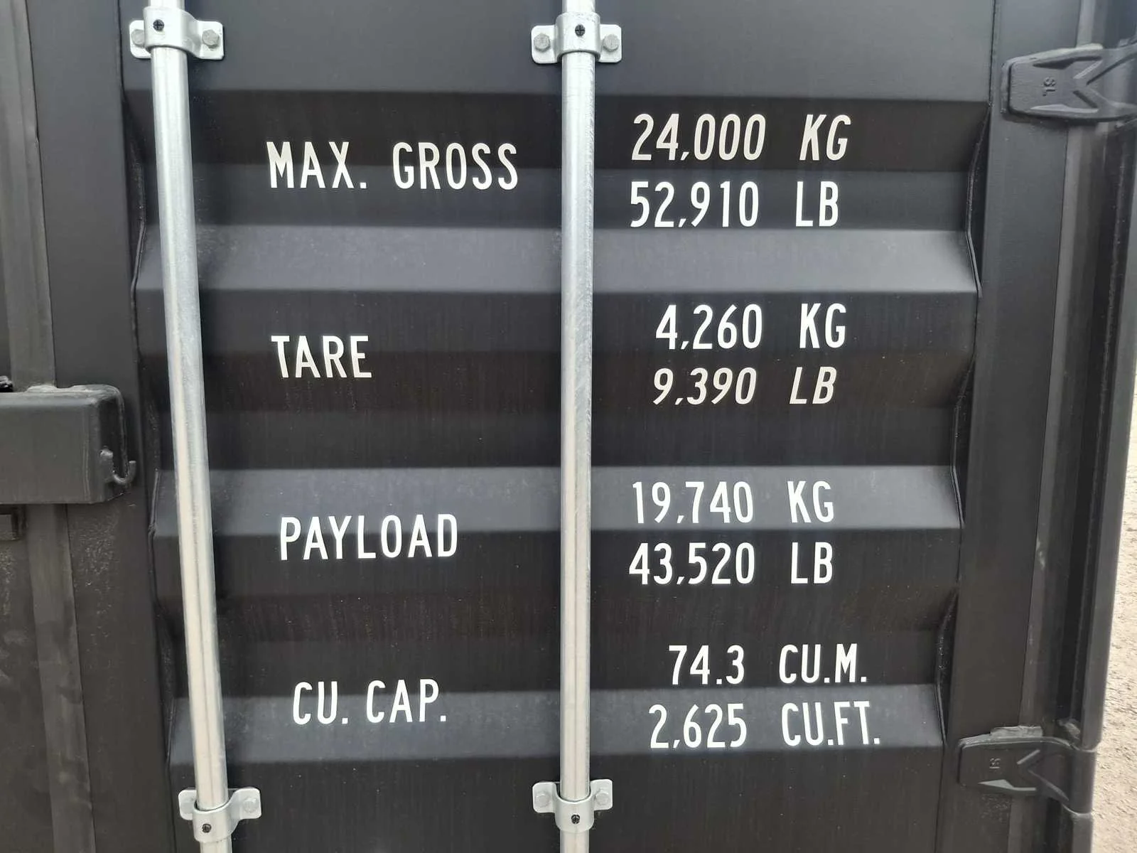 Voorzien van 4 separaat te openen zijdeuren en einddeur; slotkast; maximaal laadvermogen 24 Ton; ongebruikt Merk: LYPU Type: 40 ft High Cube Zwart Bouwjaar: 2025 Lengte (ft): 40 High cube: true Eigen gewicht: 4260kg Totale afmeting L: 12192mm Totale afmeting Breedte: 2438mm Totale afmeting Hoogte: 2896mm