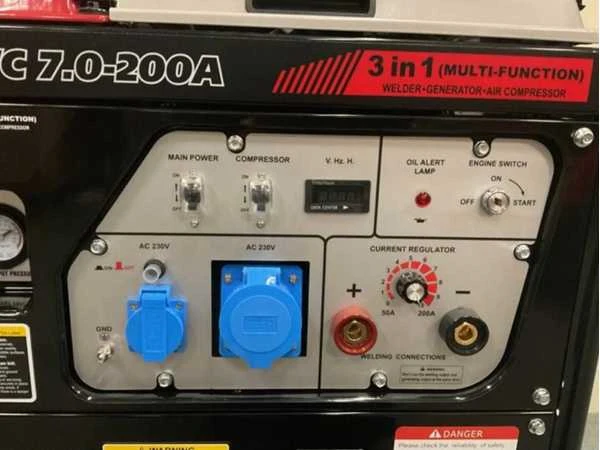 Voorzien van 230 Volt aansluiting klein en groot; elektrische start; lasmachine 200 Amp; inschakeling 50%; DC 75 Volt; compressor 10 liter; 1,35 kW; 230 Volt; max 8 bar; inclusief toebehoren; ongebruikt in doos Merk: HyperWelding Type: 3 in 1 generator-lasmachine-compressor Bouwjaar: 2024 Capaciteit.: 5.5kVA Benzine: true Mobiel: true Handboek aanwezig: true