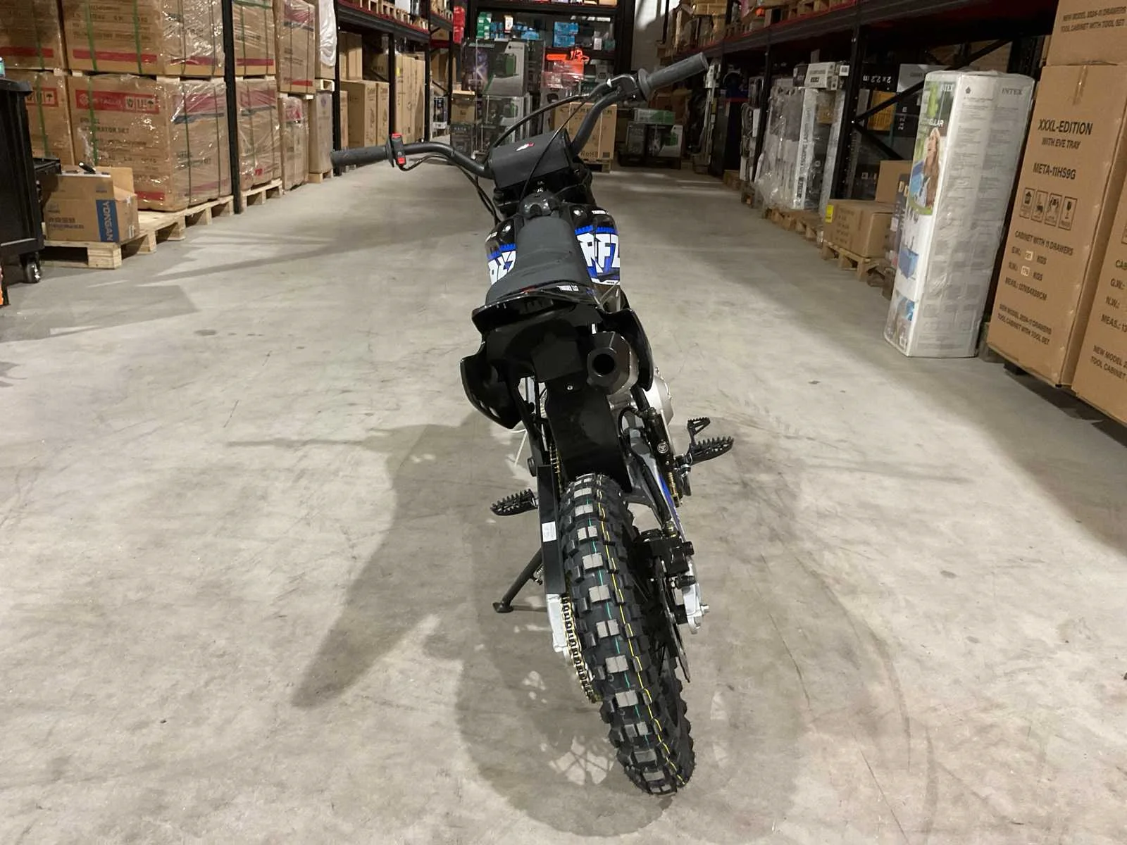 Voorzien van 110 cc motor; 4 takt; kick start; bandenmaat voor 14” inch achter 12” inch; hydraulische vering voor en achter; schijfremmen; verlichting; ongebruikt in doos (transport afmetingen 130x40x70 cm) Merk: Ultra Motocross Type: Thunder 110 BL Brandstof: Benzine Cilinderinhoud: 110cc Gewicht: 83kg Kleur: Blauw Transmissie: Automaat Aantal sleutels: 2