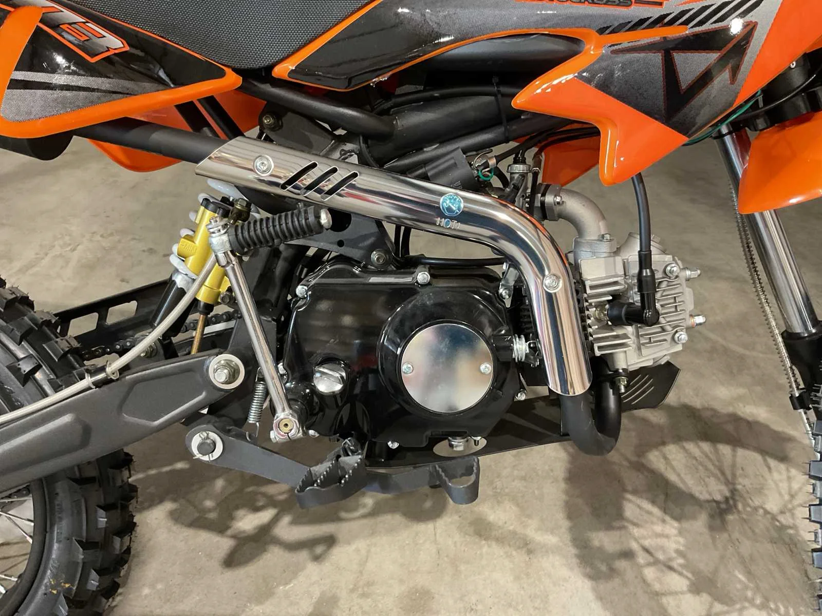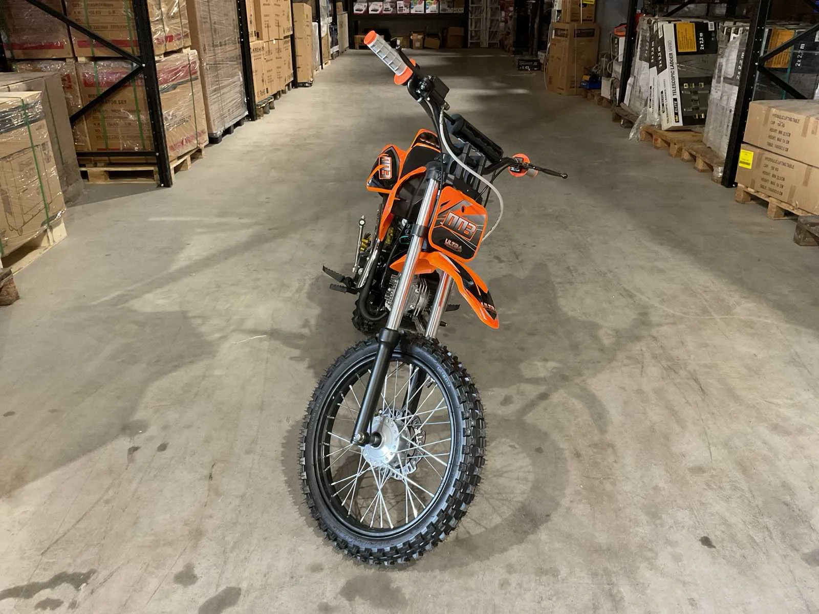 Voorzien van 110cc motor; Manuele koppeling; kickstart; Wiel/velg: V: 90/100-14 (14") A: 70/100-17 (17"); Hydraulische schijfrem; olieschokdemper; Enkele stalen uitlaatpijp; Maximale snelheid: 70 km/u; Ongebruikt in doos (Transport verpakking: 1295 x 375 x 620 mm 75kg) Merk: Ultra Motocross Model: DB001 OR Type: 110CC Cilinderinhoud: 110cc Gewicht: 68kg Kleur: Oranje zwarte zadel Transmissie: Manuele Bouwjaar: 2025