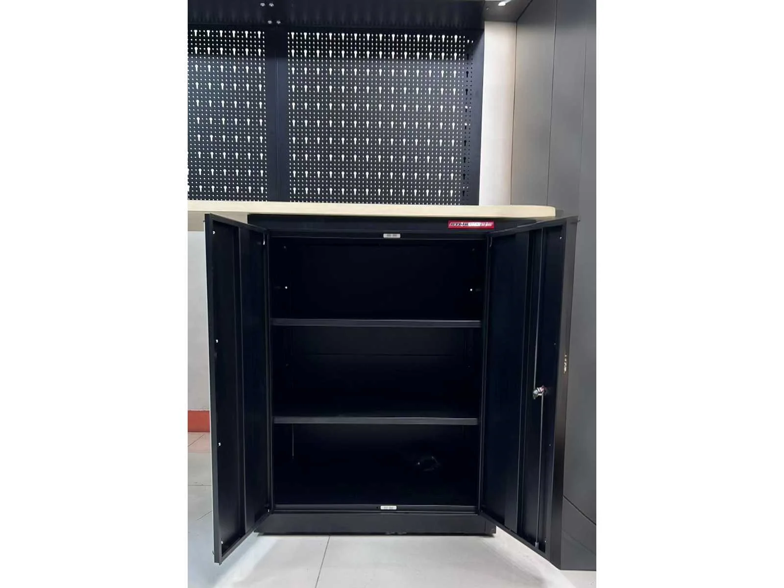 Voorzien van poeder coating; 30 mm houten werkblad; kleur zwart; ongebruikt in dozen (transport afmeting 0,9 m3) Merk: Stahlworks Model: OS-10 Product type: 225x55x203 cm Materiaal: SPCC steel