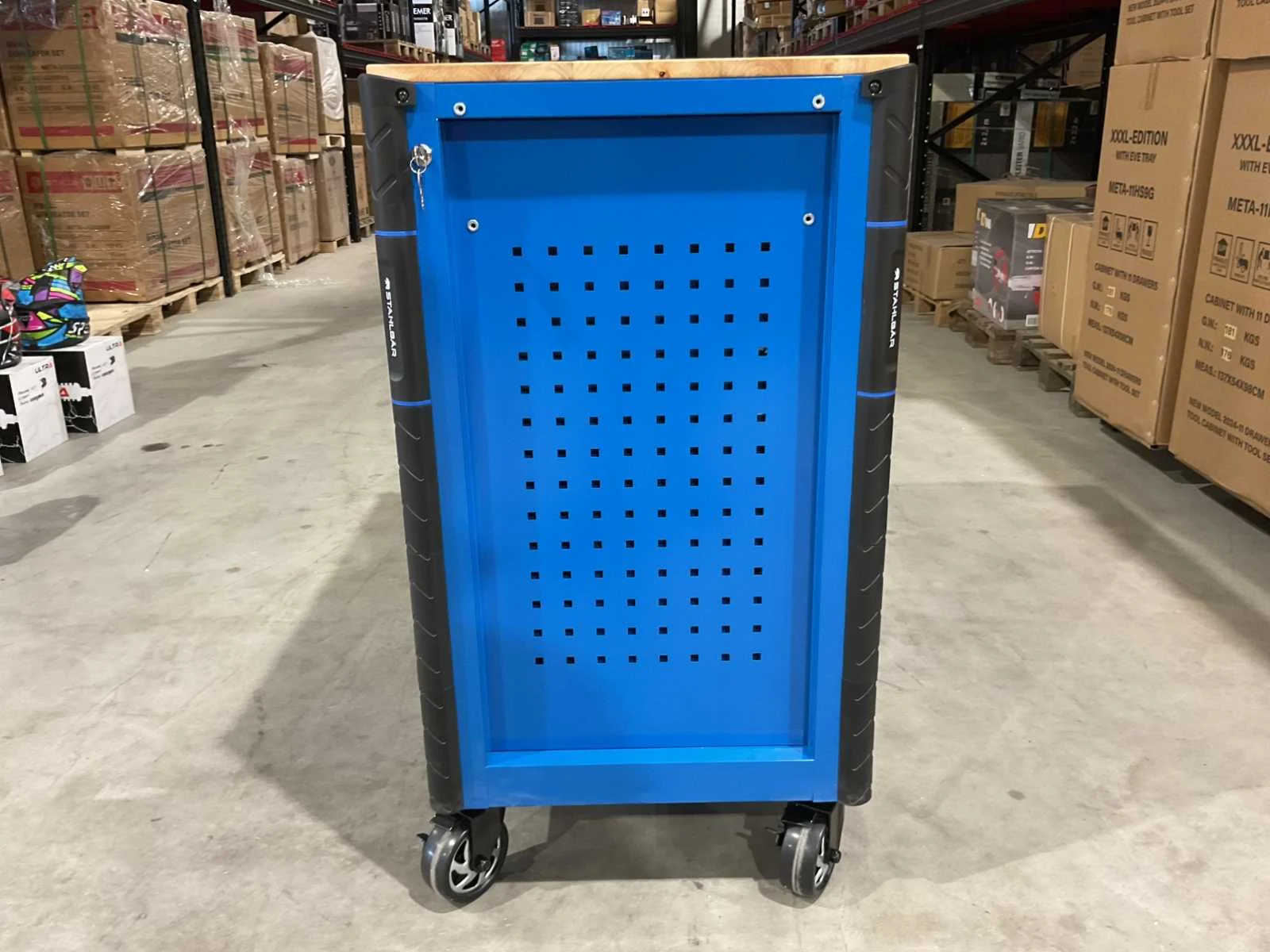 Voorzien van 13 lades waarvan 10 gevuld met gereedschap; professioneel chroom-vanadium gereedschap; heavy duty gereedschapswagen; houten werkblad; 4 wielen; stevig handvat; ongebruikt in doos (transport afmetingen 115x50x100 cm) Merk: Stahlbär Type: Deutschland XXXL PRO Bouwjaar: 2025 Aantal laden: 13 Met inhoud: true Eigen gewicht: 138kg Totale afmeting L: 1150mm Totale afmeting Breedte: 500mm Totale afmeting Hoogte: 1000mm