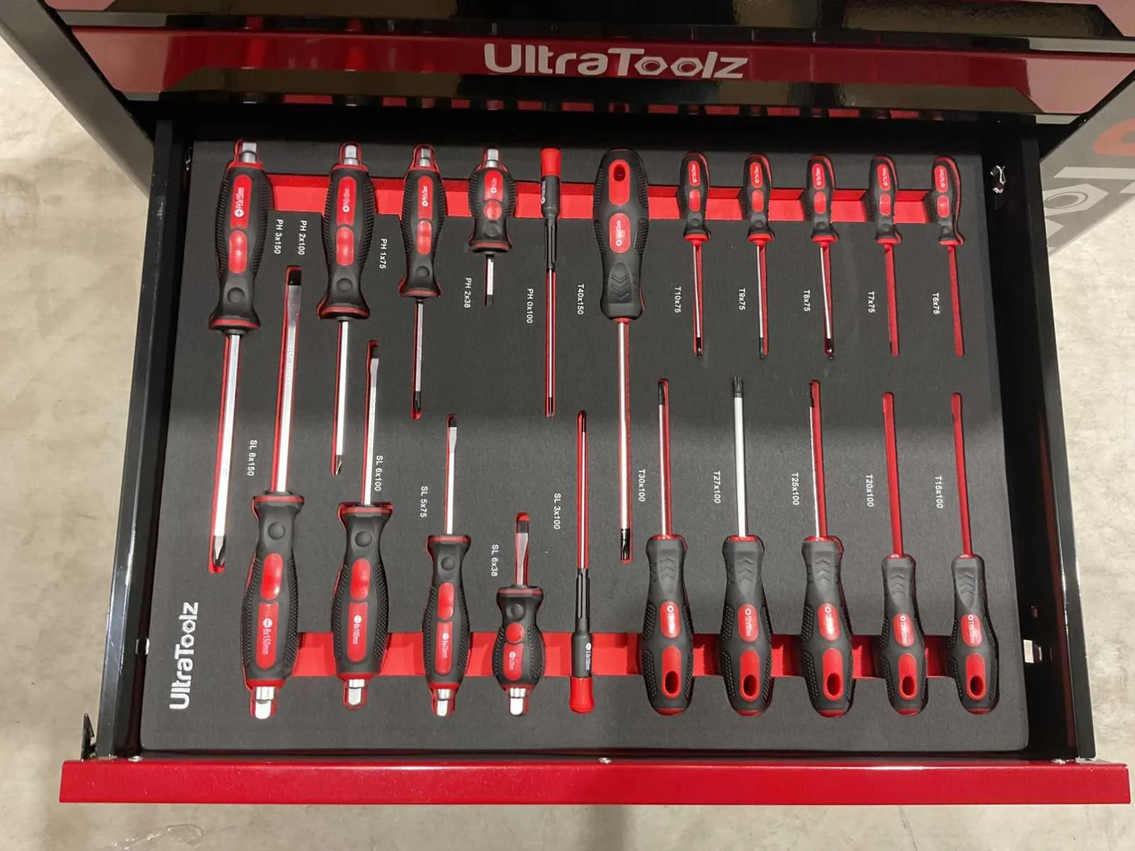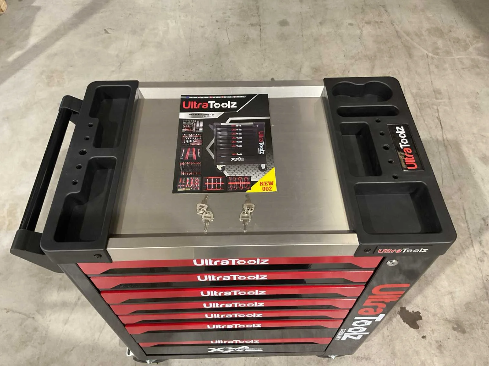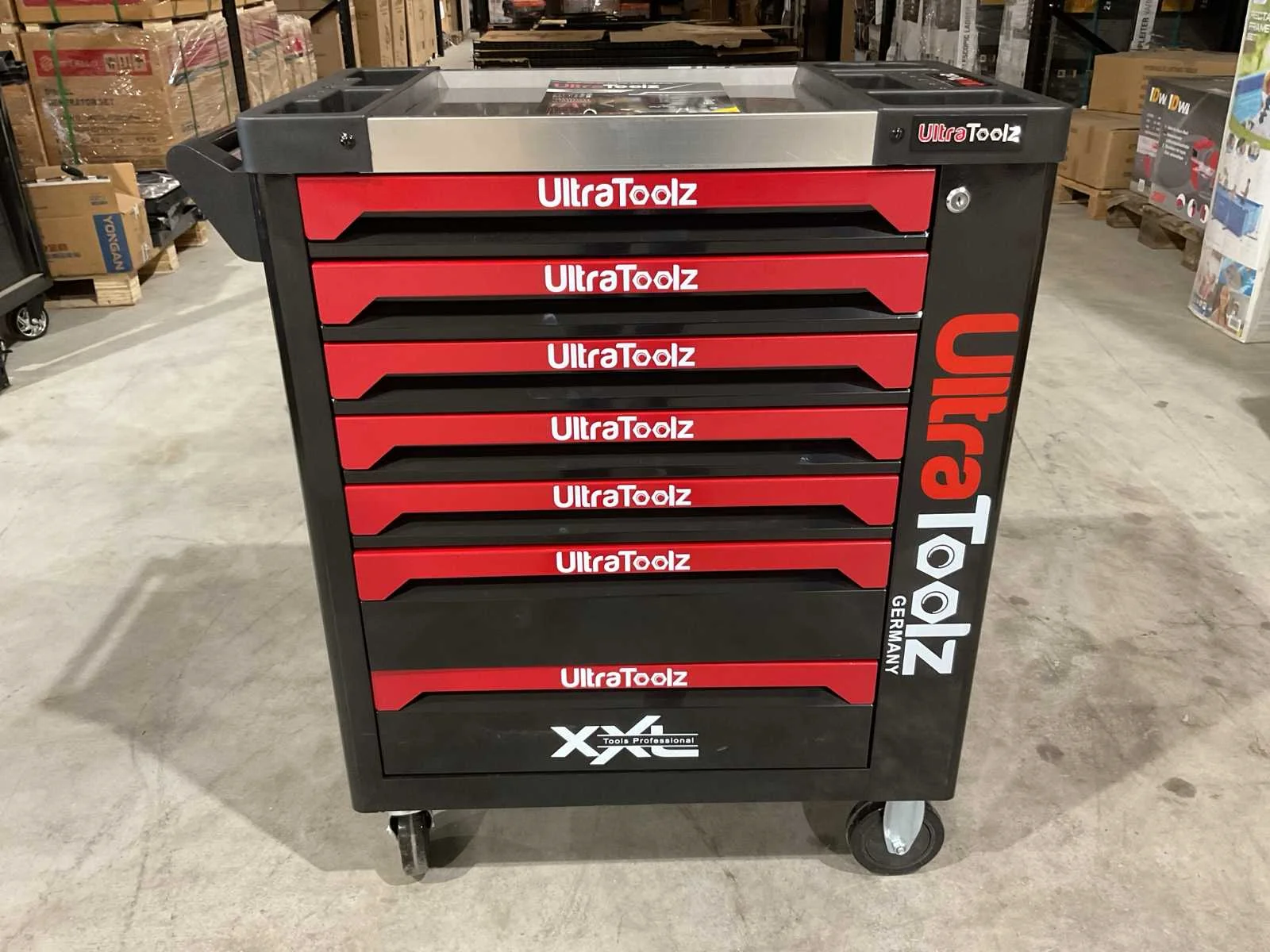 Voorzien van 7 lades waarvan 7 gevuld met gereedschap; professioneel chroom-vanadium gereedschap; heavy duty gereedschapswagen; stevig werkblad; 4 wielen; stevig handvat; ongebruikt in doos (transport afmetingen 80x50x85 cm) Merk: UltraToolz Type: Germany 7/7 Bouwjaar: 2025 Aantal laden: 7 Eigen gewicht: 76kg Totale afmeting L: 800mm Totale afmeting Breedte: 500mm Totale afmeting Hoogte: 850mm