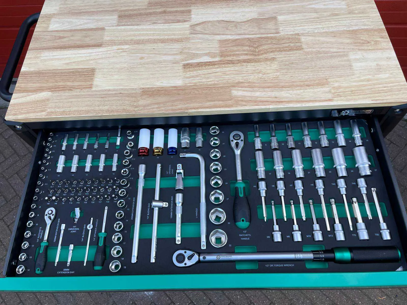 Voorzien van 11 gevulde laden; Gereedschap: chrome vanadium; Inhoud: 2 dopsleutel sets, momentsleutel, ringsteeksleutel set 6-32, ringratelsleutel 8-19, inbussleutel set, ringsleutel set 6-32, torx sleutel set T8-T70, schroevendraaier set (21 stuks), tangen set (9 stuks), beitel en doorslagen set (18 stuks), vijlen set (5 stuks), T-greep dopsleutel set 6-14, T-greep torx sleuel set T15-T45, hamers (3 stuks), VDE gereedschap (3 tangen en 7 schroevendraaiers), kabelschoentang set, enzovoort; Ongebruikt in doos Merk: Stahlgruppe Type: Jumbo GR Bouwjaar: 2024 Aantal laden: 13 Met inhoud: true Eigen gewicht: 138kg Totale afmeting L: 1100mm Totale afmeting Breedte: 620mm Totale afmeting Hoogte: 1120mm