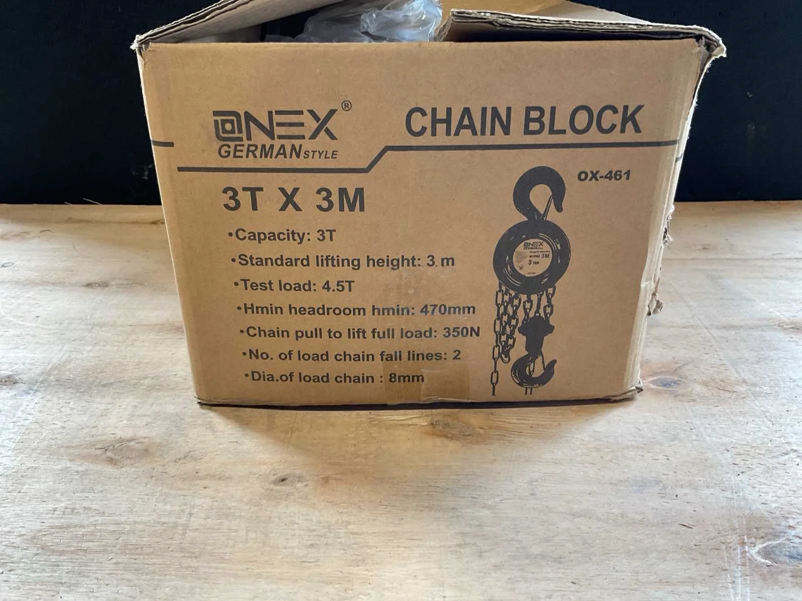 Merk: Onex German Style Type: OX-461 Bouwjaar: 2025 Hijsvermogen: 3000kg Max. hefhoogte: 3m Eigen gewicht: 15.8kg Totale afmeting L: 340mm Totale afmeting Breedte: 230mm Totale afmeting Hoogte: 180mm