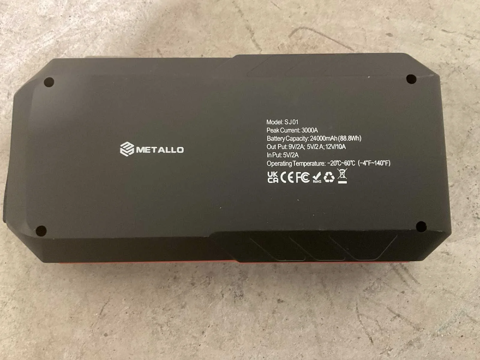 Maximale vermogen: 3000A; Batterij capiciteit: 24000mAh (88.8Wh); Laadtijd: 6 uur; Temperatuur 20-60 graden celcius; 12V/10A DC output; 9V/2A QC 3.0 output; 5V/2A input; 5V/2Aoutput; Positive wire clip; Negative wire clip; LCD Display; Aan/uit knop; Compass; LED licht; Ongebruikt (Transport Afmetingen: 135 x 100 x 240 mm, Gewicht 1kg ) Merk: Metallo Type: Jumpstarter Bouwjaar: 2025 Spanning: 12V Laadstroom: 12A Aansluiting: 5V Eigen gewicht: 1kg Totale afmeting L: 135mm Totale afmeting Breedte: 100mm Totale afmeting Hoogte: 240mm