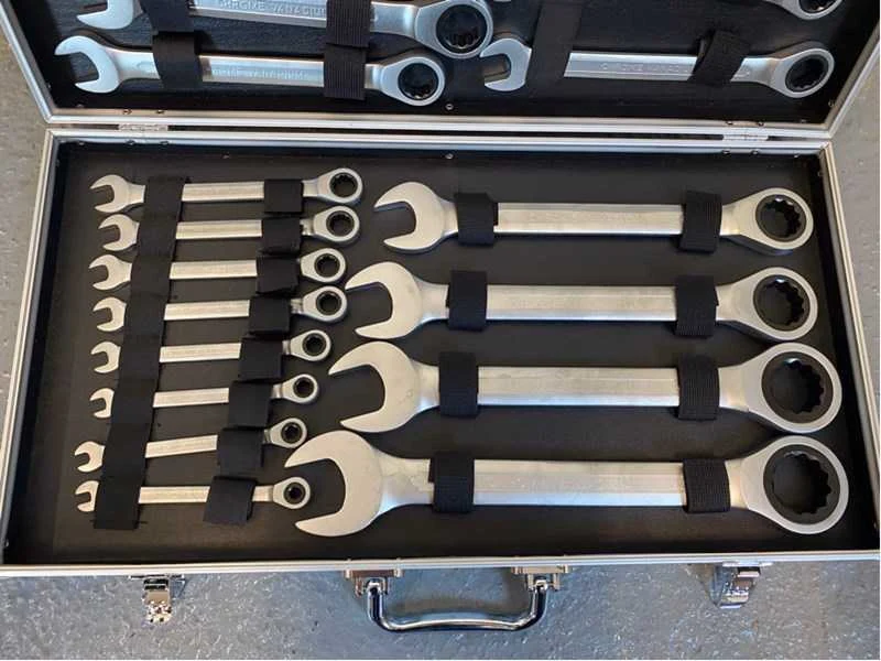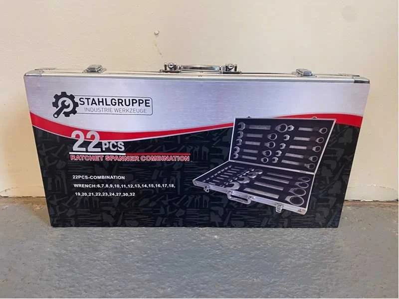 Voorzien van steek met ringratel sleutel set; maten 6, 7, 8, 9, 10, 11, 12, 13, 14, 15, 16, 17, 18, 19, 20, 21, 22, 23, 24, 27, 30, 32; ongebruikt in verpakking Merk: Stahlgruppe Set: true Delig: 22 Bouwjaar: 2024 Type: 22 delig