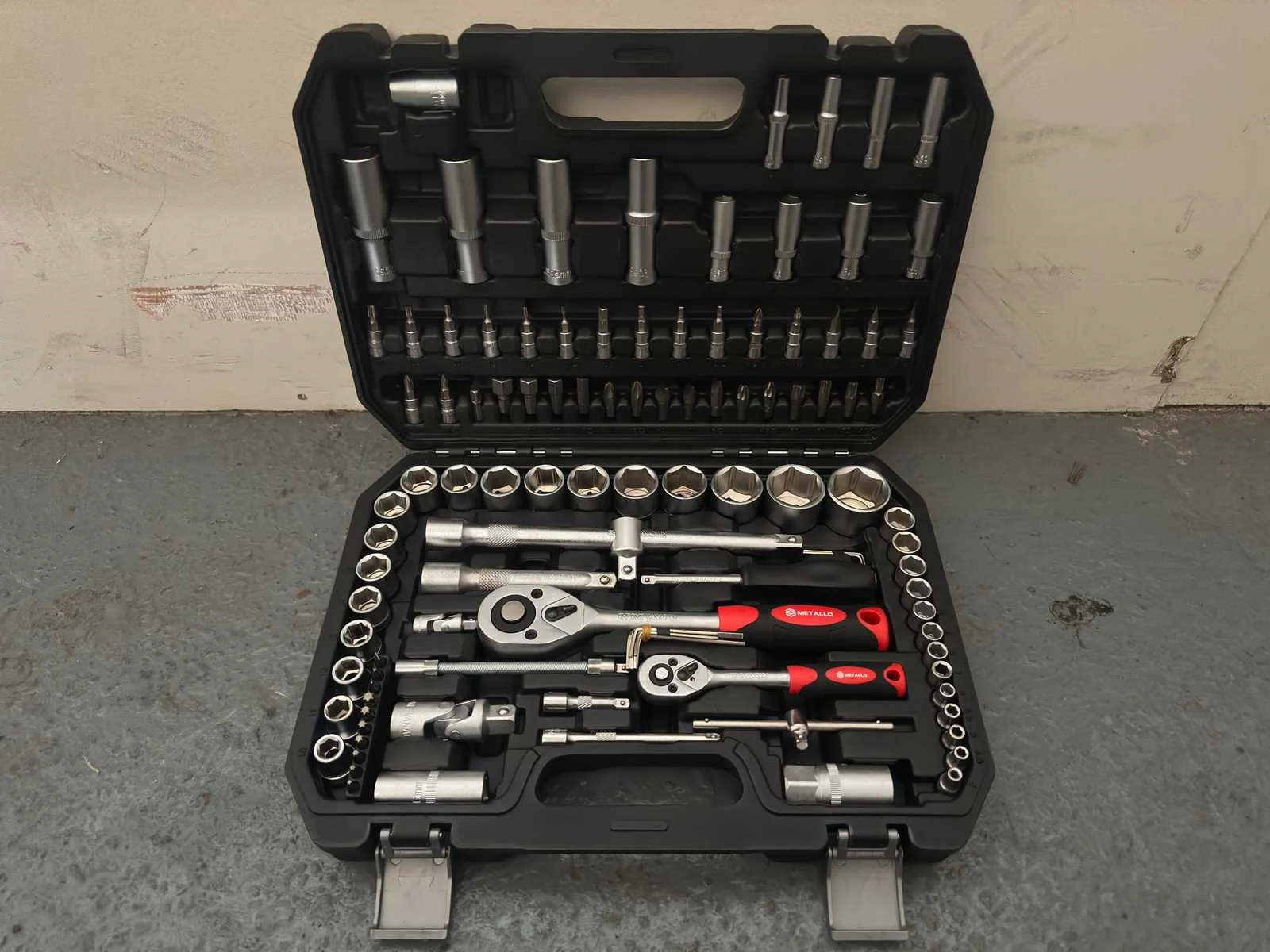 Voorzien van 13 x doppenset DR6PTREG maten 4-4,5-5-5,5-6-7-8-9-10-11-12-13-14; 8 1/4” DR6PT diepe doppen maten: 6-7-8-9-10-11-12-13; 3 x 1/4” DRBIT Doppen: FD 4-5,5-7; 2 x 1/4” DRBIT Doppen: PH1-PH2; 2 x 1/4” DRBIT doppen: PZ1-PZ2; 4 x 1/4” DRBIT Doppen: HW 3-4-5-6; 6 X 1/4” DRBIT Doppen: TX 8-10-15-20-25-30; 1 X 1/4” Doppenadapter; 1 x 1/4” DR Ratelsleutel; 2 x 1/4” DR verlengstuk 2”-4”; 1 x 1/4” verstelbare t sleutel; 1 x 1/4” DR universele koppeling; 1 x DR Spinnersleutel; 1 x DR Flexibele spinner sleutel; 18 x 1/2” DR6PTREG doppen: 10-11-12-13-14-15-16-17-18-19-20-21-22-23-24-27-30-32; 4 x 1/2” DR6PTDEEP doppen: 14-15-17-19; 2 x 1/2” DREXTENTION: 5-10’; 2 x 1/2” Bougie sleutel 16-21; 1 x 1/2” DR Universele koppeling; 1 x 1/2” DR 8 Hexagon bit koppeling; 1 x 3/8” Fx1/2”M 3weg adapter; 5 x inbussleutel 1,5-2-25 25-bits; kunststof koffer; Ongebruikt in doos Merk: Metallo Met koffer: true Delig: 106 Type: META-106W Bouwjaar: 2024