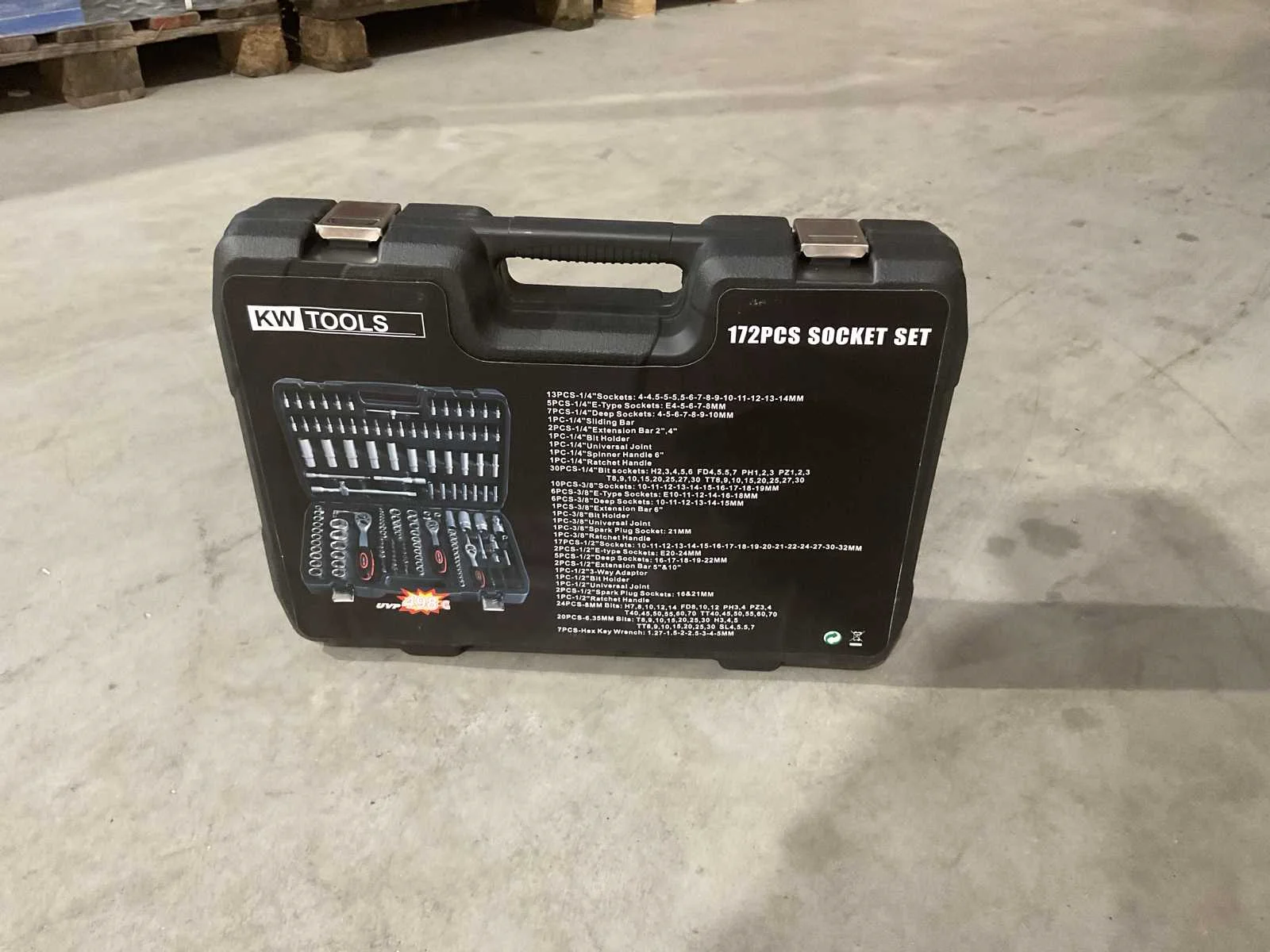 13 stuks 1/4 " Socket: 4,4,5,5,5,5,6,7,8,9,10,11,12,13,14 mm; 7 stuks 1/4 " diepe wandcontactdoos 4,5,6,7,8,9,10 mm; 5 stuks 1/4 " E-doppen E4, E5, E6, E7, E8; 2 stuks 1/4 " verlengstang 2 'en 4"; 1 stuk 1/4 " Sliding T-Bar; 1 stuk 1/4 " universele koppeling; 1 stuk 1/4 " koppeling; 1 stuk 1/4 " Quick Release ratelhendel; 30 stuks 1/4 " Bit-doppen; 10 stuks 3/8 " Doppen 10,11,12,13,14,15,16,17,18,19mm; 6 stuks 3/8 " Sockets 10,11,12,13,14,15; 5 stuks 3/8 " E-doppen E10, E11, E12, E14, E16, E18; 1 stuk 3/8 " Extention Bar 5"; 1 stuk 3/8 " koppeling ;1 stuk 3/8 " Bougie Dop 18 mm; 1 stuk 3/8 " Quick Release Ratchet Hanlde;18 stuks 1/2 " Sockets 10,11,12,13,14,15,16,17,18,19,20,21,22,23,24,27,30,32mm; 5 stuks 1/2 " diepe doppen 16,17,18,19,22 mm; 3 stuks 1/2 " E-doppen E20, E24; 2 stuks 1/2 " Extension Bar 5" & 10 "(met driewegadapter); 1 stuk 1/2 " universele verbinding; 1 stuk 1/2 " koppeling; 2 stuks 1/2 " Bougie Dop 16 mm en 21 mm; 1 stuk 1/2 " Quick Release ratelhendel; 1 stuk Inbussleutel Set 1,1.5,2,2.5,3,4,5mm; 20 stuks 25mm bits in bits houder; 24 stuks 30mm bits; 1 stuk spinnerhandvat; Ongebruikt in doos (Transport afmeting 460 x 95 x 350, Gewicht 8.68 KG) Merk: KW Tools Met koffer: true Delig: 172 Type: 172PCS Socket Set Bouwjaar: 2025