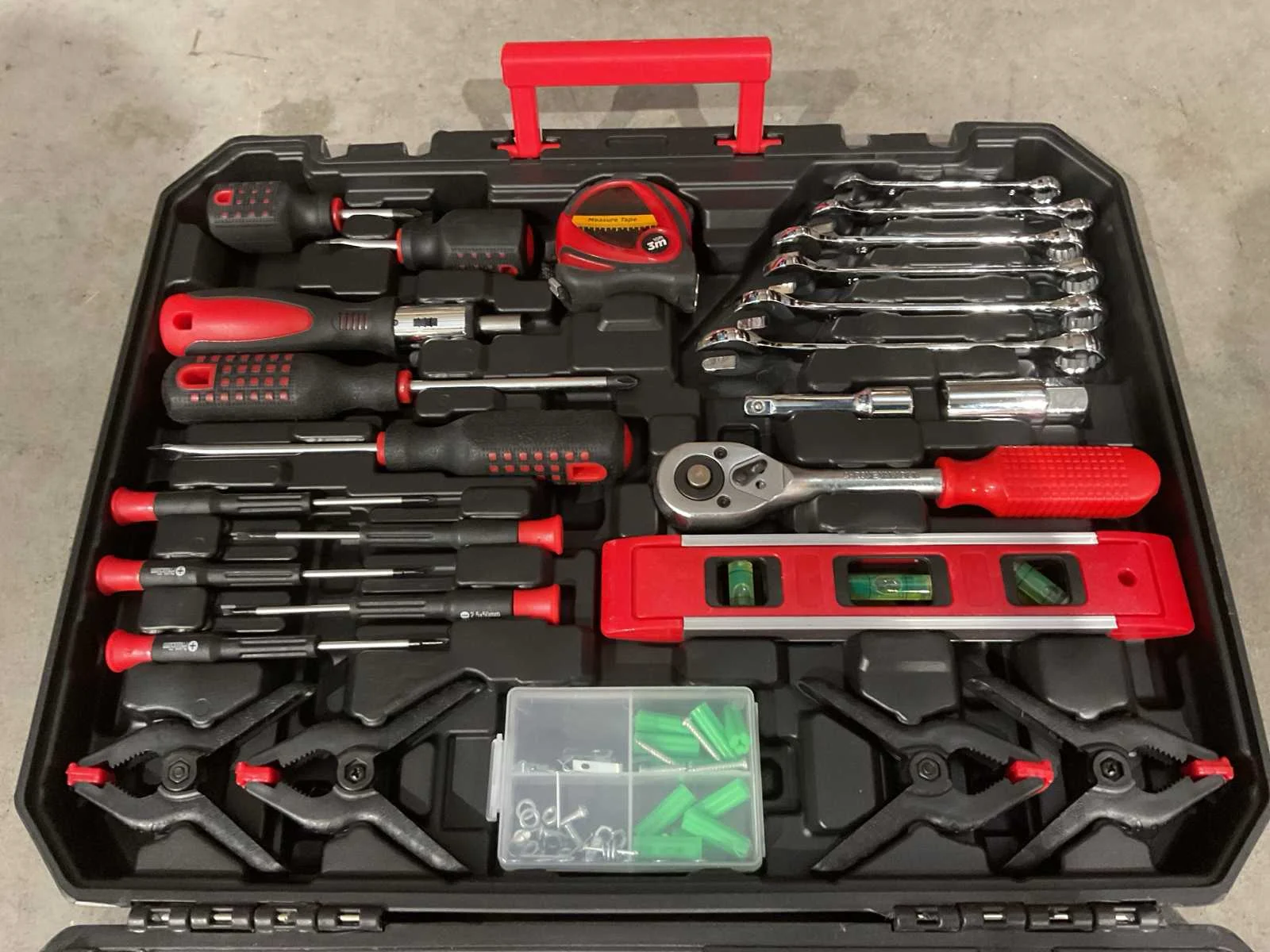 Voorzien van 4 stuks schroevendraaiers SL6*38, SL6*100; PH2*38, PH2*100; 1 stuk bit driver handvat; 1 stuk meetlint 3m; 5 stuks precisieschroevendraaiers; 4 stuks plastic dips; 60 stuks assortiment bevestigingsmiddelen in een doos; 1 stuk Niveau; 1 stuk 3/8dr ratelhandvat; 1 stuk 3/8dr verlengstuk; 1 stuk 3/8dr bougiedop; 6 ringsteeksleutels 8-10-12-13-14-15 cm; 1 stuk 3/8&1/4 adapter; 12 stuks 1/4dr doppen 4-4.5-5-5.5-6-7-8-9-10-11-12-13MM; 10 stuks 3/8dr doppen 10-11-12-13-14-15-16-17-18-19MM; 1 stuk bitverlengstuk; 1 stuk isolatietape; 1 stuk ijzerzaag; 9 stuks inbussleutels 1.5-2-2.5-3-4-5-6-8-10mm; 10 stuks bits 50 mm; 20 stuks bits 25mm; 1 stuk mes; 1 stuk 6'lnesnun tang; 1 stuk 6' langbektang; 1 stuks 6' verstelbare sleutel;1 stuk 8''waterpomptang; 1 stuk 6'' krimptang; 1 stuks klauwhamer; Ongebruikt in doos (Transport afmeting 450 x 90 x 360, Gewicht 5.58 KG) Merk: Metallo Met koffer: true Delig: 156 Type: META-156W Bouwjaar: 2025