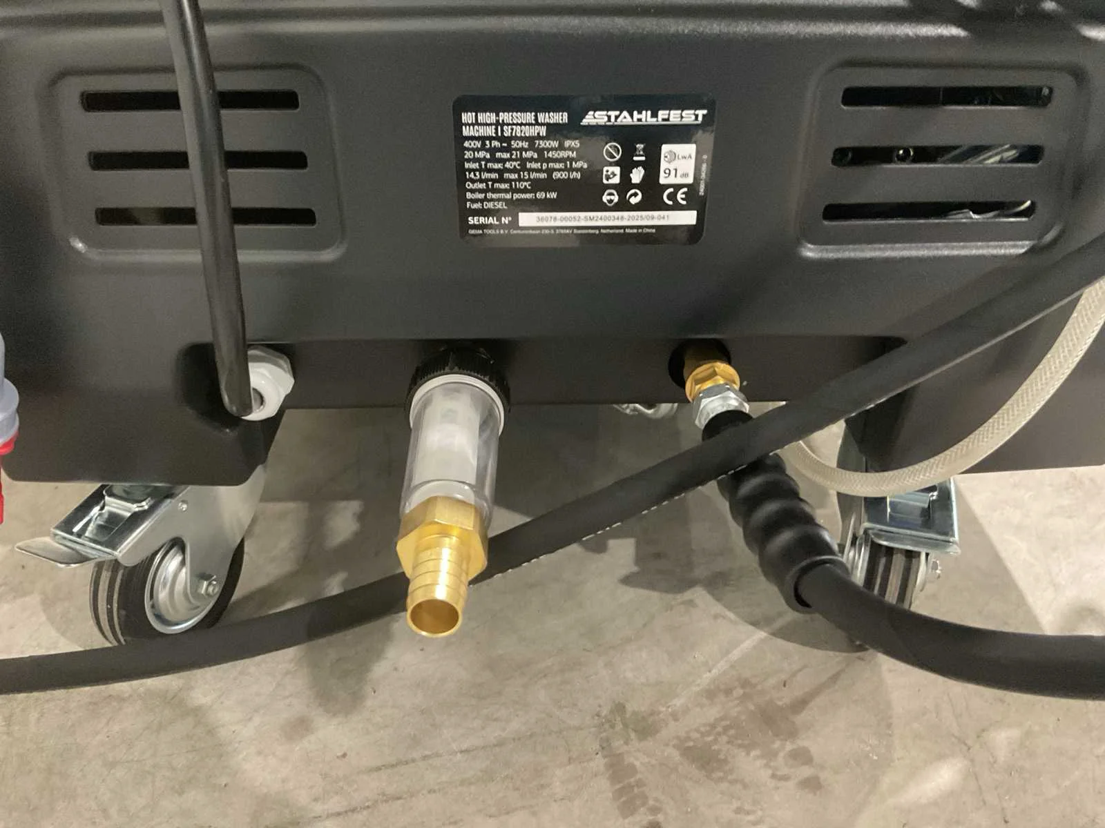 Voorzien van Spanning: 380 - 400V; Fase: 3 Hertz: 50 Hz; Thermisch vermogen: 58 kW; Ketelvoorziening: diesel; Maximale waterdruk: 210 bar; Werkdruk: 20 MPa; Maximale druk: 21 MPa; Pomp: 1450 tpm; Debiet: 15 l/min; Maximale temperatuurinvoer: 140°C; 10mtr slang; Ongebruikt in kist (Afmeting transport verpakking 730x545x620 mm lxbxh, gewicht 165 kg) Merk: Stahlfest Type: SF7820HPW Bouwjaar: 2025 Maximale werkdruk: 210bar Temperatuurbereik max.: 140°c Capaciteit.: 900l/hr Mobiel: true Vermogen: 7300kW Aansluiting: 400V Eigen gewicht: 165kg Totale afmeting L: 730mm Totale afmeting Breedte: 545mm Totale afmeting Hoogte: 620mm