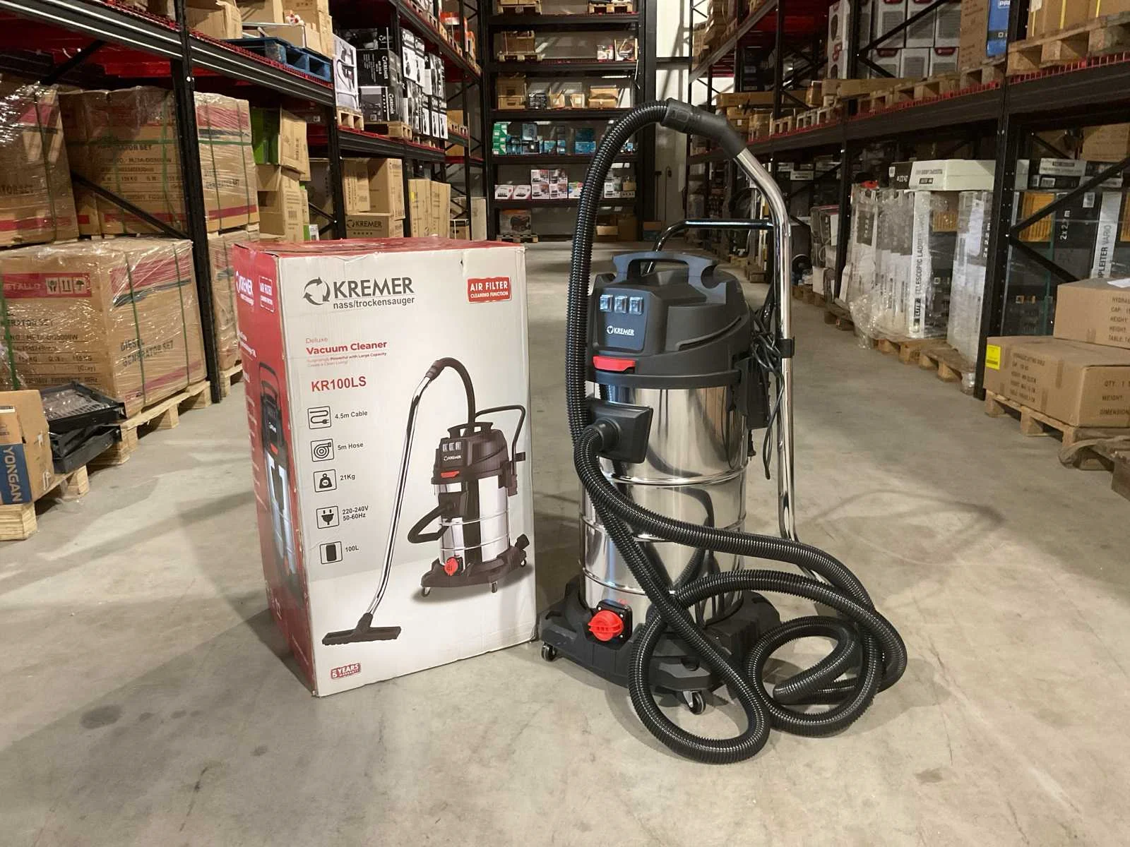 Voorzien van 4,5 meter kabel; 5 mtr zuigslang; Nat- en droog stofzuiger; Inhoud 100 Liter; 3 Motoren onafhankelijk; 3000W; Klopfunctie; Blaasfunctie; RVS Ketel; Aflaat dop; 4 Zwenkwielen; Ongebruikt in doos (Afmeting transport verpakking 550x550x1000 mm lxbxh, gewicht 21 kg) Merk: Kremer Type: KR100LS Bouwjaar: 2025 Vermogen: 3000W Zakloos: true Nat/droog zuiger: true Stopcontact: true Aansluiting: 220V