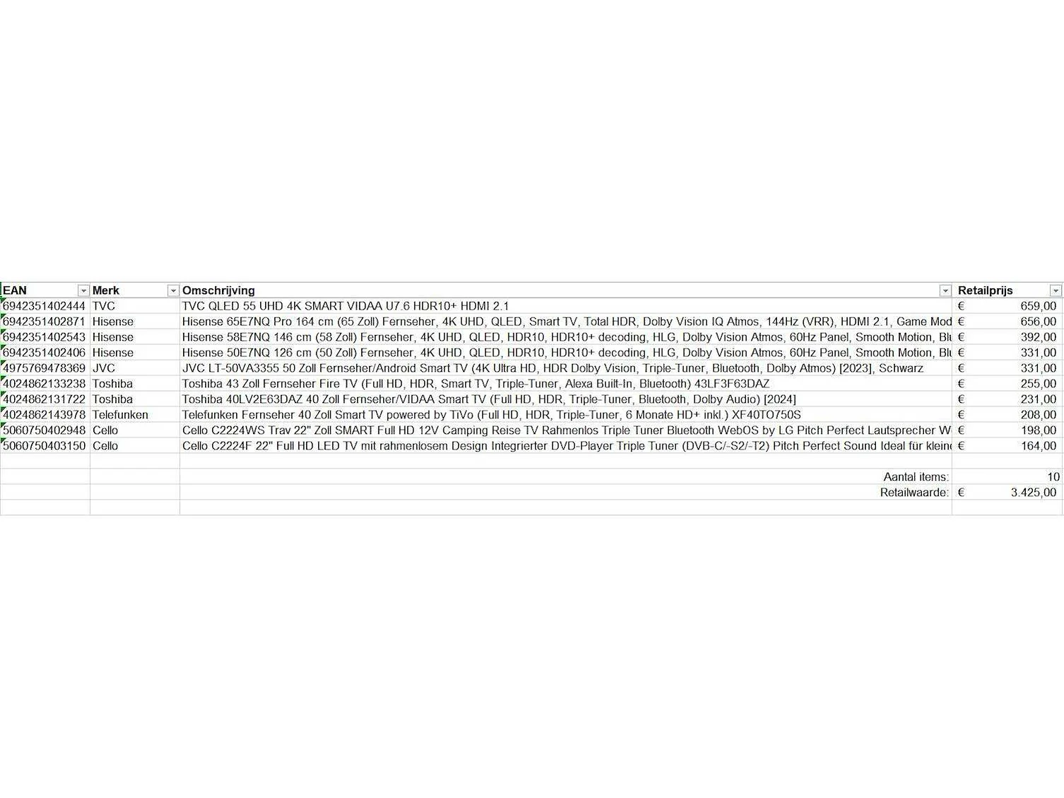 Dit betreft een partij televisies retourgoederen van een grote online retailer. De partij bestaat uit diverse diverse maten televisies. Aantal stuks: 10. Retailwaarde: €3425,- De televisies zijn niet werkend en zijn te gebruiken voor onderdelen. Kom op de kijkdag om te om zo een goed beeld te krijgen van de reden van retour. Zie foto's voor lijst met inhoud. Merk: Pallet Retourgoederen