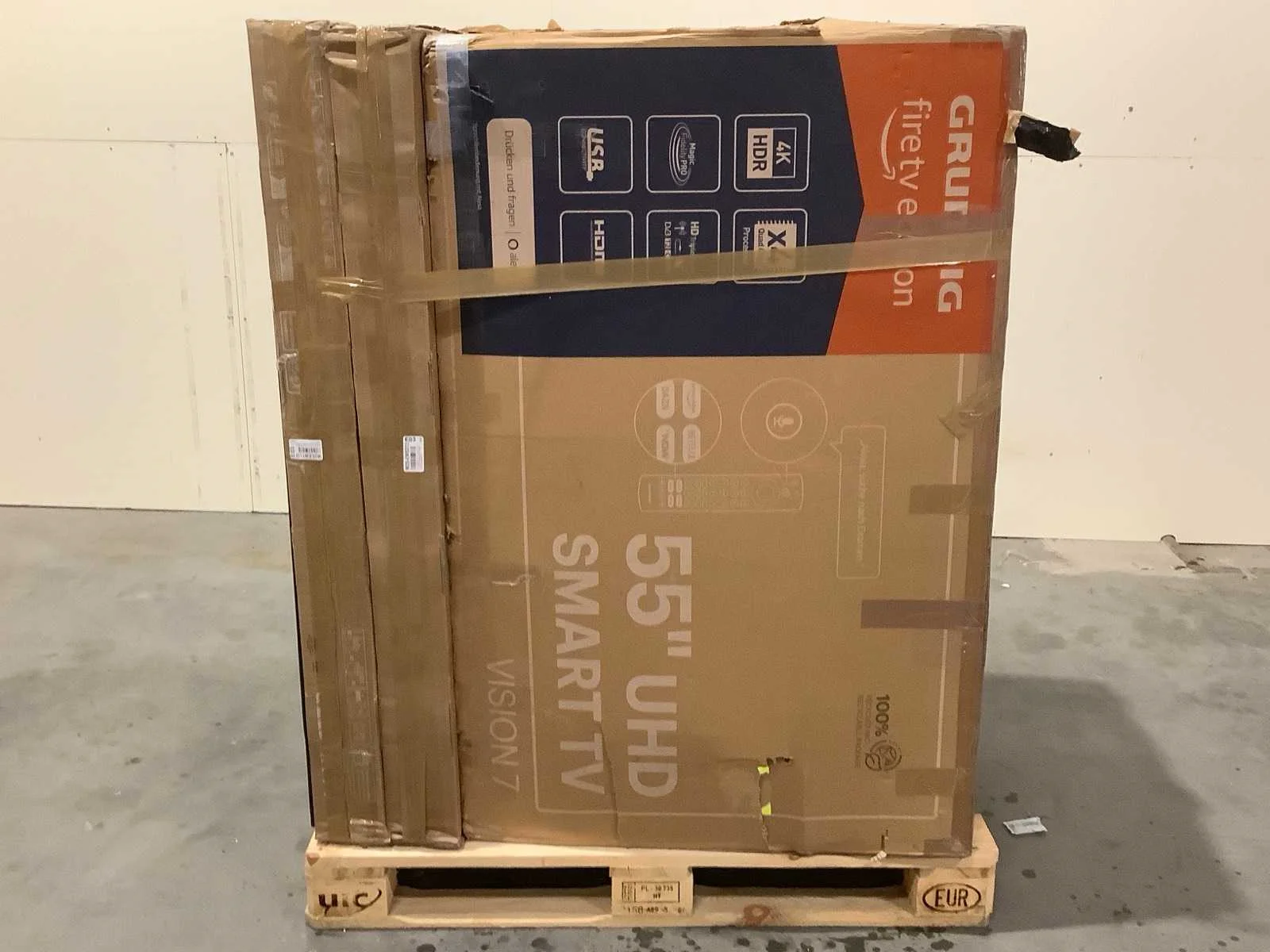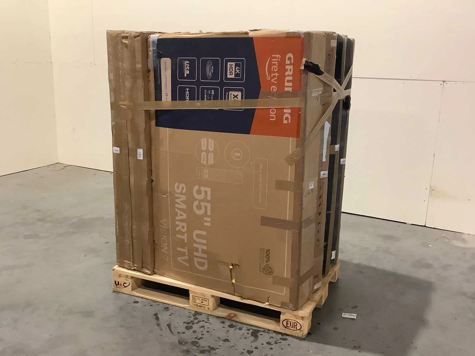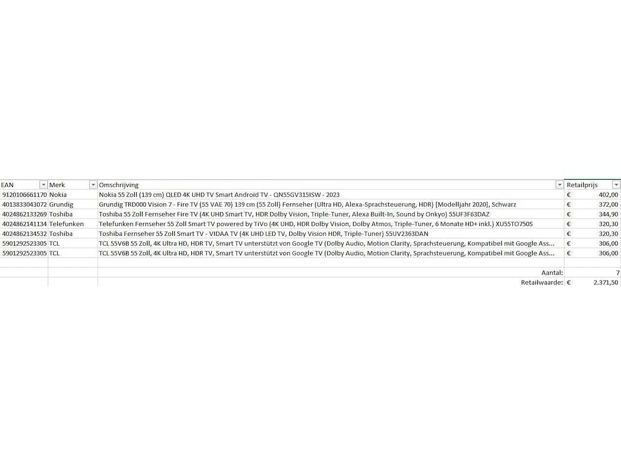 Dit betreft een partij televisies retourgoederen van een grote online retailer. De partij bestaat uit diverse diverse maten televisies. Aantal stuks: 7 Retailwaarde: €2.371,- De televisies zijn niet werkend en zijn te gebruiken voor onderdelen. Kom op de kijkdag om te om zo een goed beeld te krijgen van de reden van retour. Zie foto's voor lijst met inhoud. Bezorgtermijn 14 dagen Merk: Pallet Retourgoederen