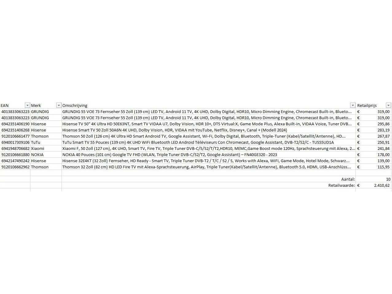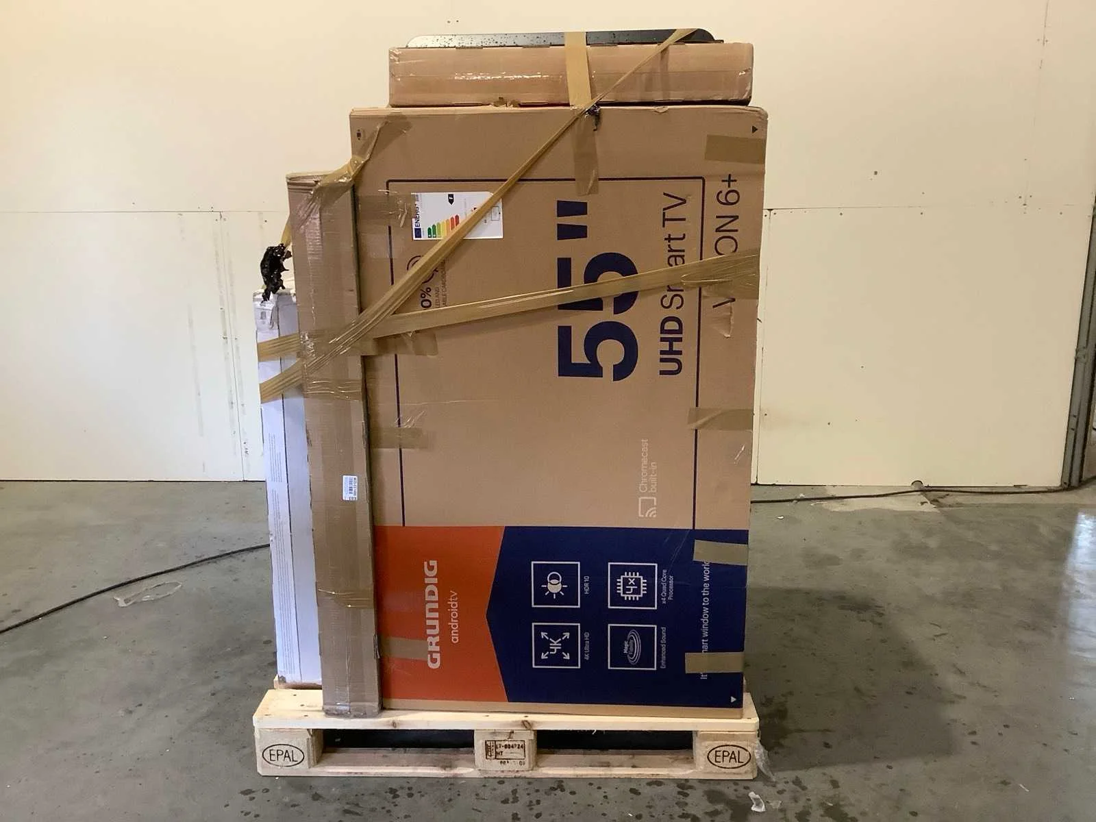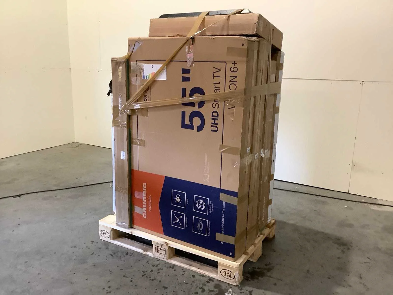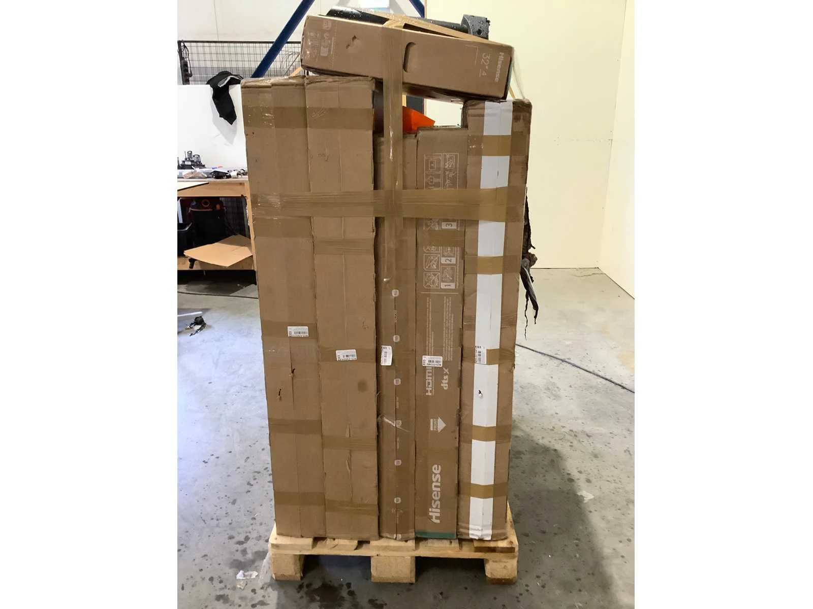 Dit betreft een partij televisies retourgoederen van een grote online retailer. De partij bestaat uit diverse diverse maten televisies. Aantal stuks: 10. Retailwaarde: €2.410,- De televisies zijn niet werkend en zijn te gebruiken voor onderdelen. Kom op de kijkdag om te om zo een goed beeld te krijgen van de reden van retour. Zie foto's voor lijst met inhoud. Bezorgtermijn 14 dagen Merk: Pallet Retourgoederen