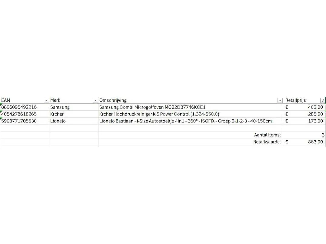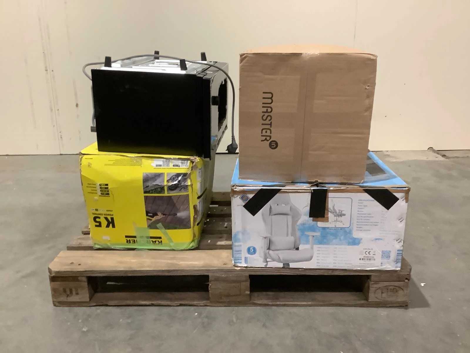 Dit betreft een partij A-merk retourgoederen van een grote online retailer. De partij bestaat uit diverse productcategorieën. Aantal stuks: 3. Retailwaarde: €863,- Ongecontroleerd: werking onbekend (mix van werkend, incompleet, beschadigd, te gebruiken voor onderdelen). Kom op de kijkdag om te om zo een goed beeld te krijgen van de reden van retour. Zie foto's voor lijst met inhoud. Bezorgtermijn 14 dagen Merk: Pallet Retourgoederen