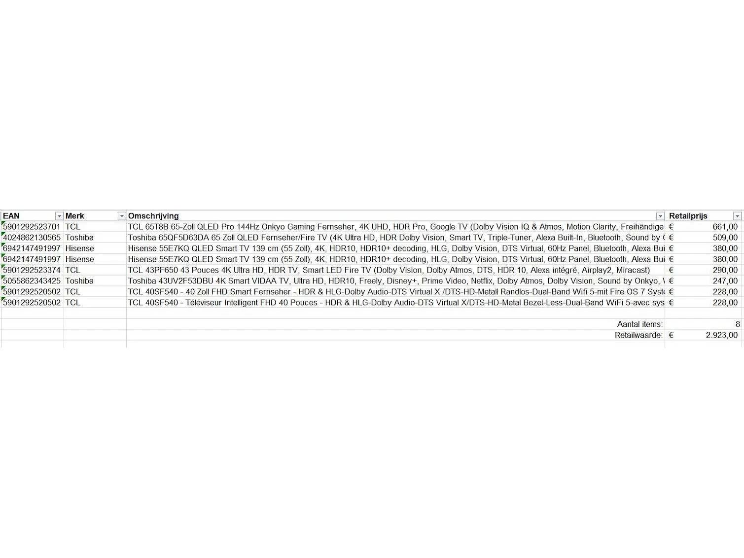Dit betreft een partij televisies retourgoederen van een grote online retailer. De partij bestaat uit diverse diverse maten televisies. Aantal stuks: 8. Retailwaarde: €2923,- De televisies zijn niet werkend en zijn te gebruiken voor onderdelen. Kom op de kijkdag om te om zo een goed beeld te krijgen van de reden van retour. Zie foto's voor lijst met inhoud. Merk: Pallet Retourgoederen