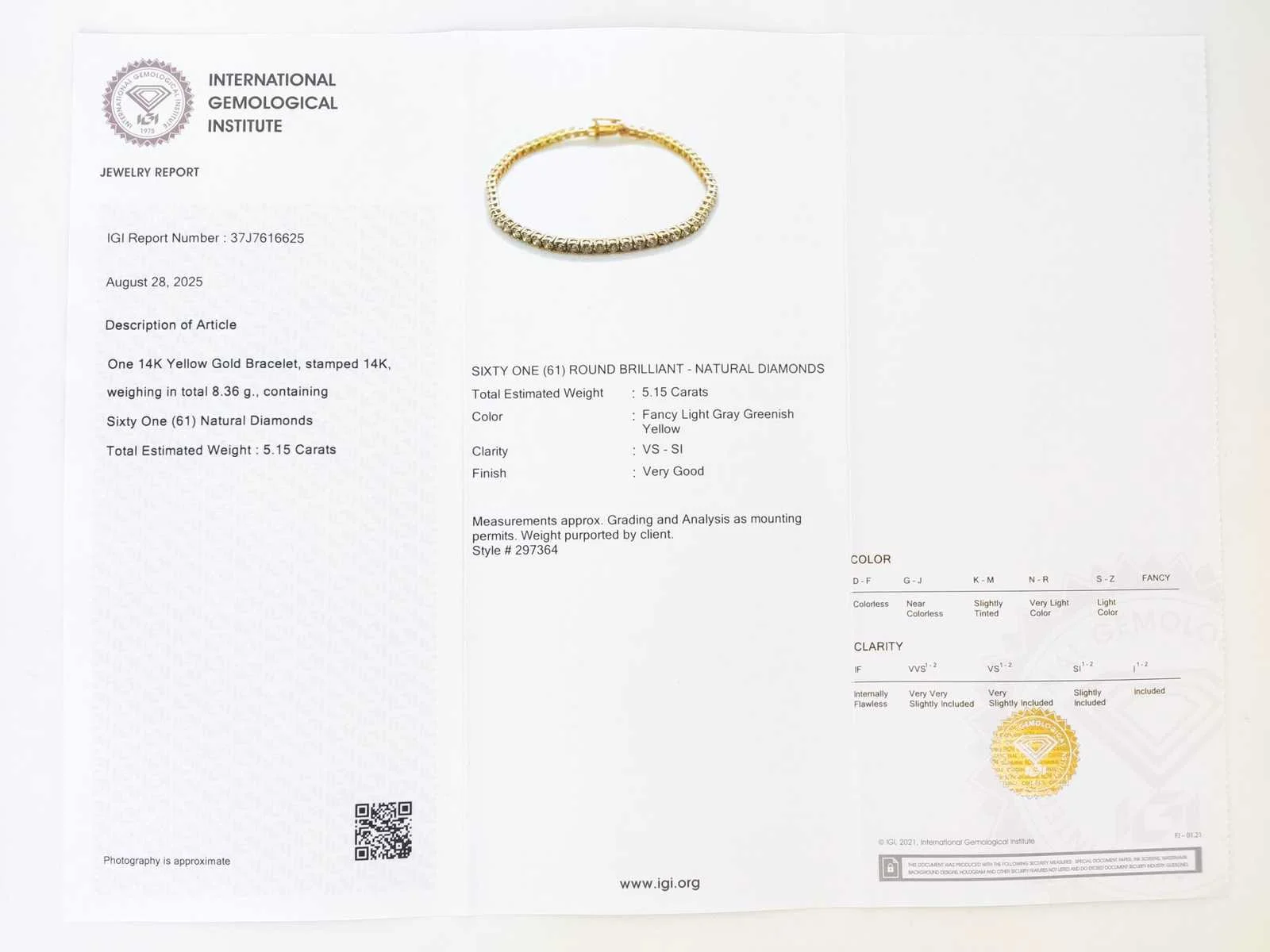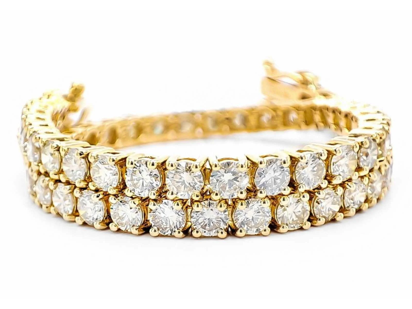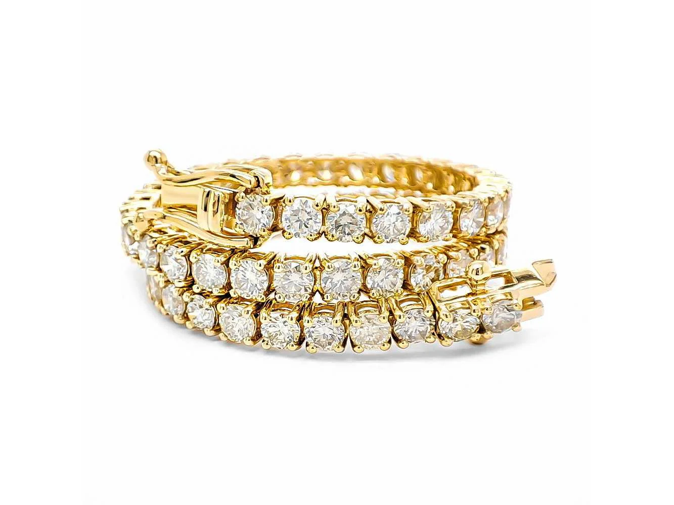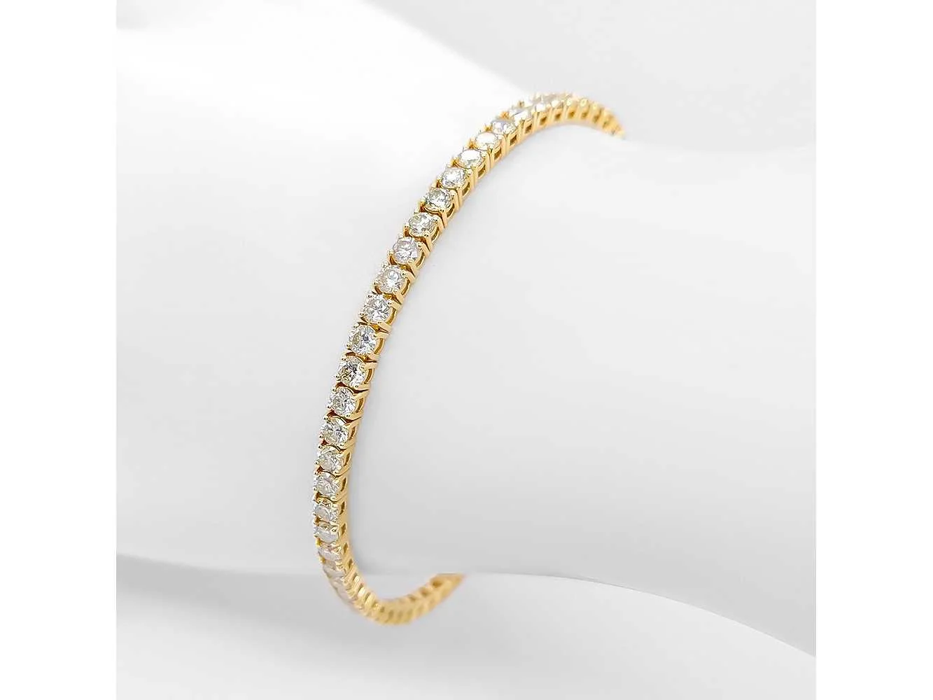 Ongebruikt Slijpvorm: Rond Briljant Carat: 5,15 crt Duidelijkheid: VS-SI Bezichtiging op afspraak Model: Tennisarmband Materiaal: Geel goud Slijpkwaliteit diamant: Briljant Slijpvorm edelsteen: Briljant Gewicht: 8g Lengte: 18cm Lage schatting: 10000€ Hoge schatting: 11800€