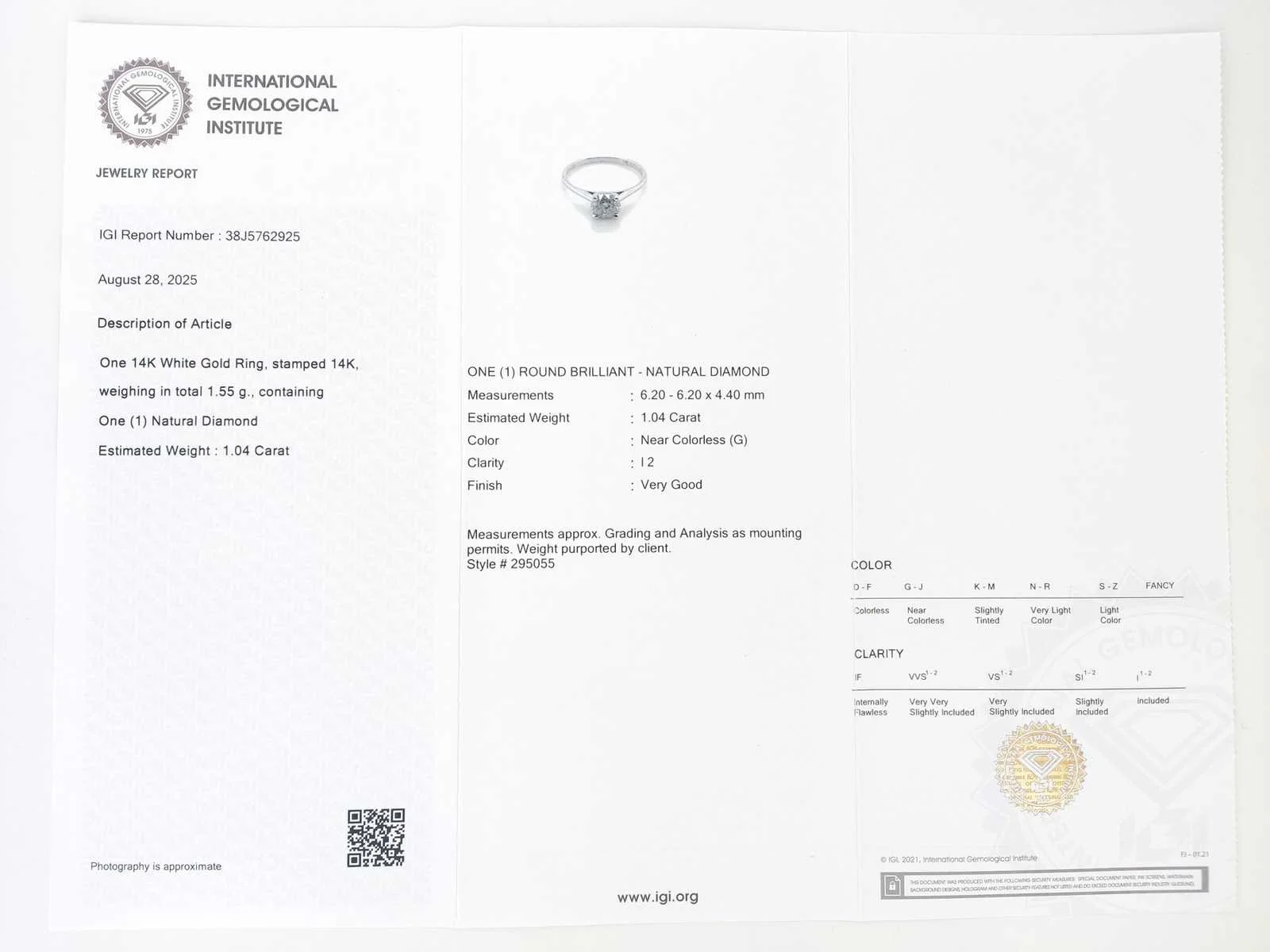 Ongebruikt Vorm: rond Briljant Gewicht: 1,04 CRT Kleur: G Duidelijkheid: I2 Pools: Uitstekend Symmetrie: Uitstekend Rapportnummer IGI 14K wit goud Met IGI-certificaat Bezichtiging op afspraak Product type: 14 karaat wit goud Slijpvorm diamant: Rond Briljant Ringmaat: 54 Slijpvorm: rond Certificaat: Ja Materiaal: 14 karaat wit goud Lage schatting: 4800€ Hoge schatting: 5500€