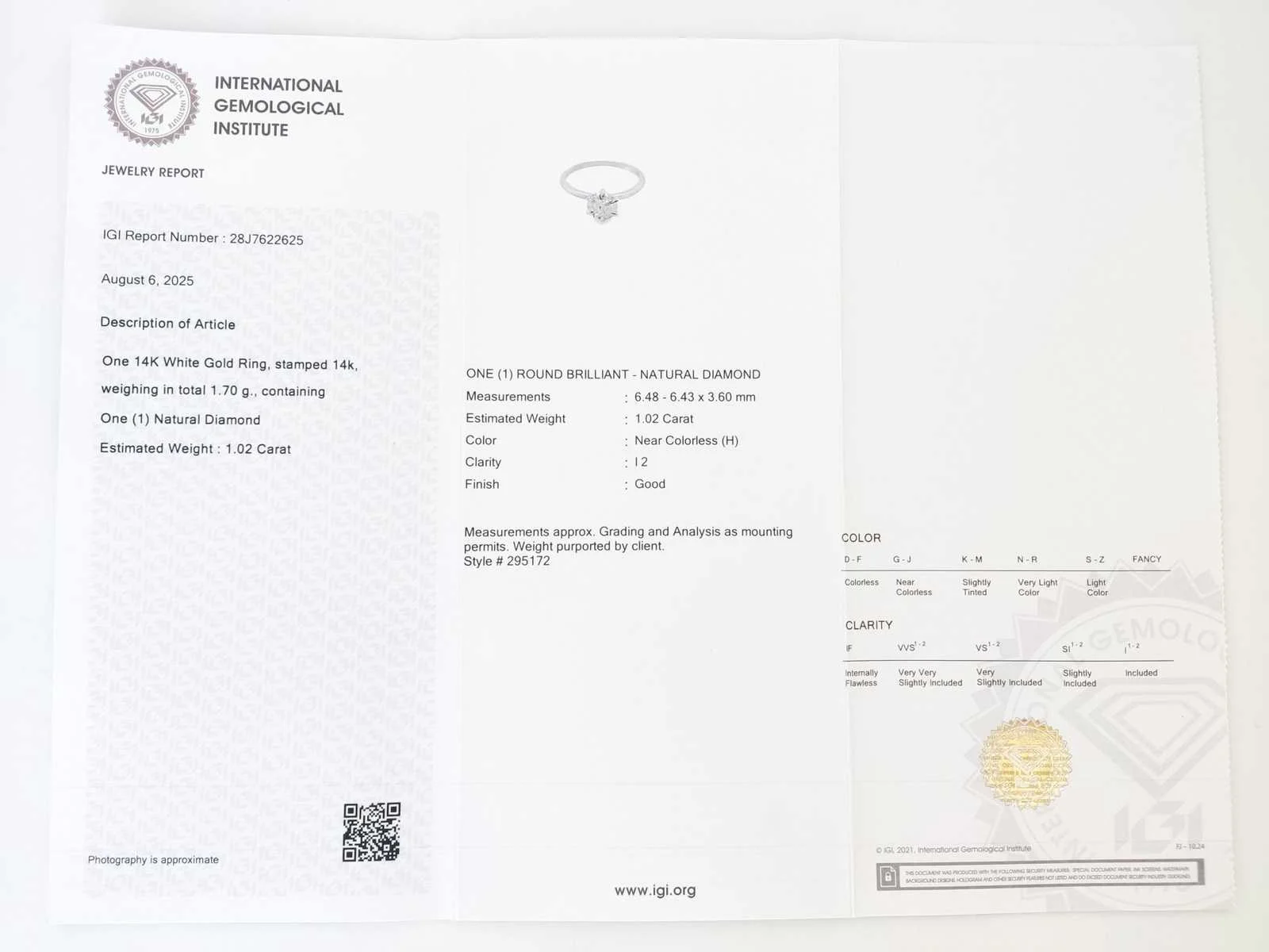 Ongebruikt Vorm: rond Briljant Gewicht: 1,02 CRT Kleur: H Duidelijkheid: I2 Pools: Uitstekend Symmetrie: Uitstekend Rapportnummer IGI 14K wit goud Met IGI-certificaat Bezichtiging op afspraak Product type: 14 karaat wit goud Slijpvorm diamant: Rond Briljant Ringmaat: 54 Slijpvorm: rond Certificaat: Ja Materiaal: 14 karaat wit goud Lage schatting: 4700€ Hoge schatting: 5500€