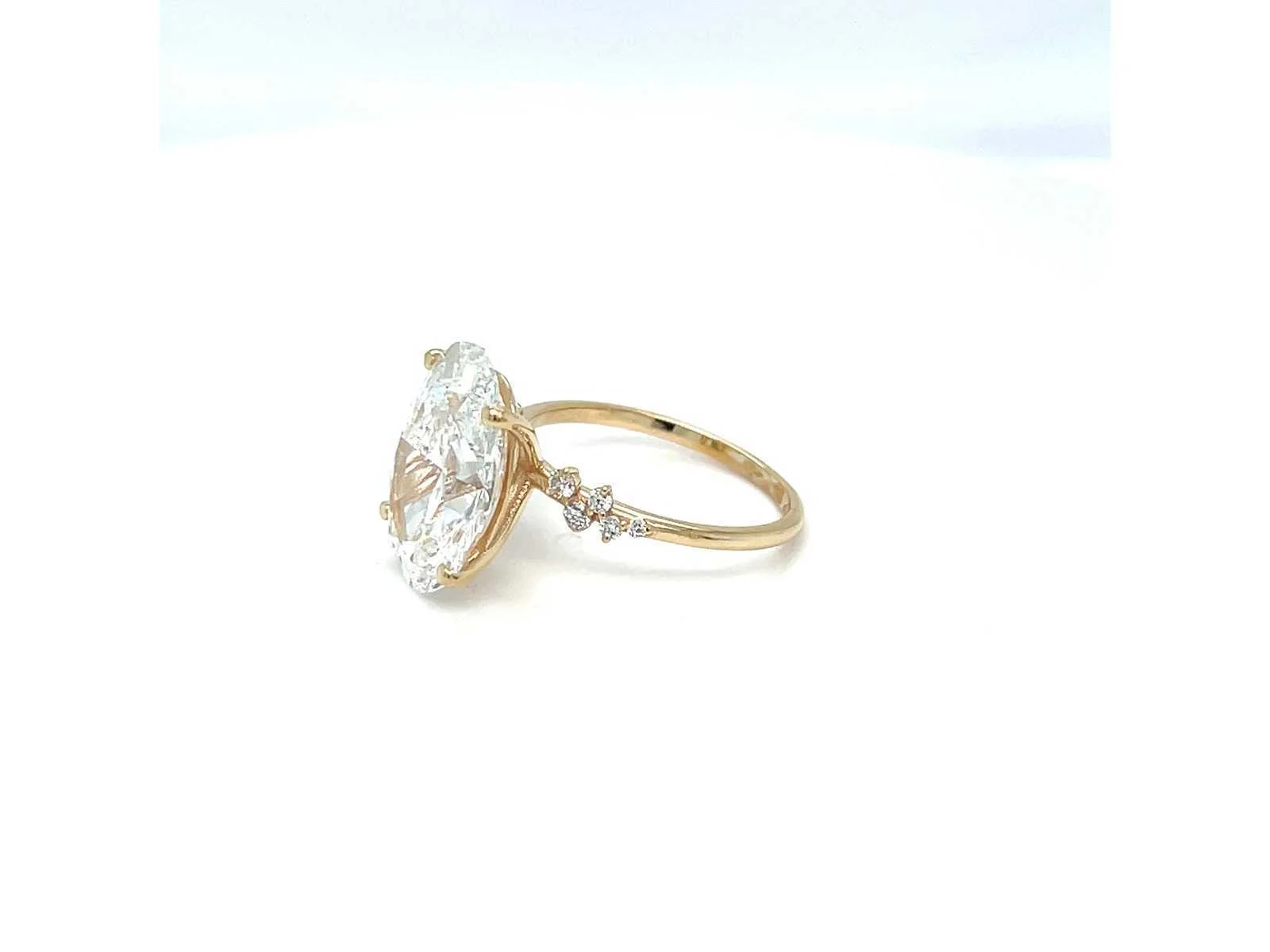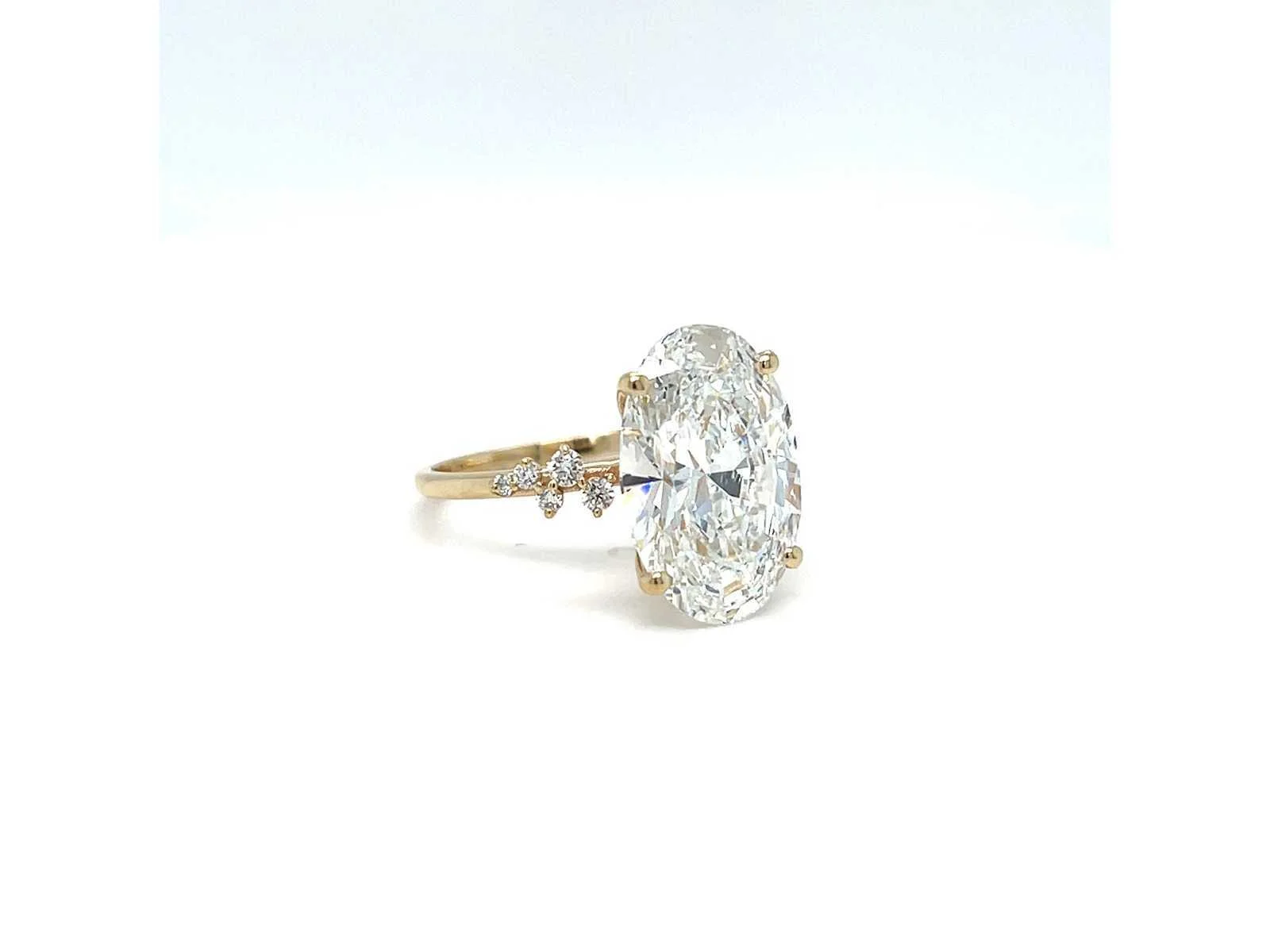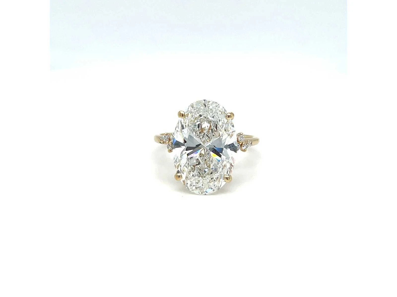Vorm: ovaal Gewicht: 7,09 CT Kleur: E Helderheid: VS1 Symmetrie: uitstekend Fluorescentie: geen Bijstenen: 10 stuks van 0,20 ct rond Bezichtiging op afspraak. Materiaal: Geelgoud Ringmaat : 55 Certificaat: ja Lage schatting: 18900€