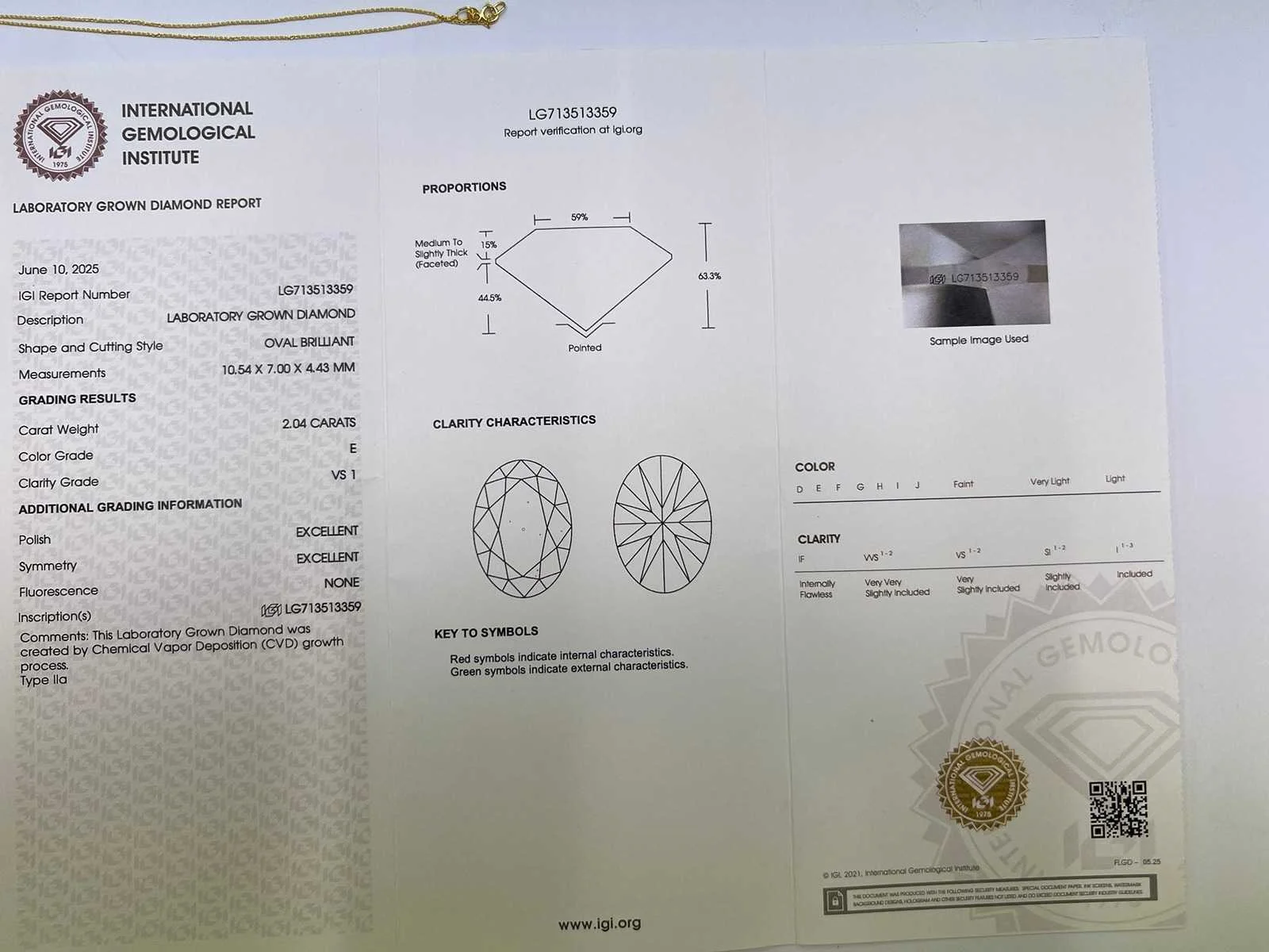 Vorm: ovaal briljant Totaal Gewicht: 2.04CT Kleur: E Helderheid: VS1 Uitstekend Symmetrie: uitstekend Bezichtiging op afspraak Materiaal: Geelgoud Ringmaat : 55 Certificaat: ja Lage schatting: 3300€